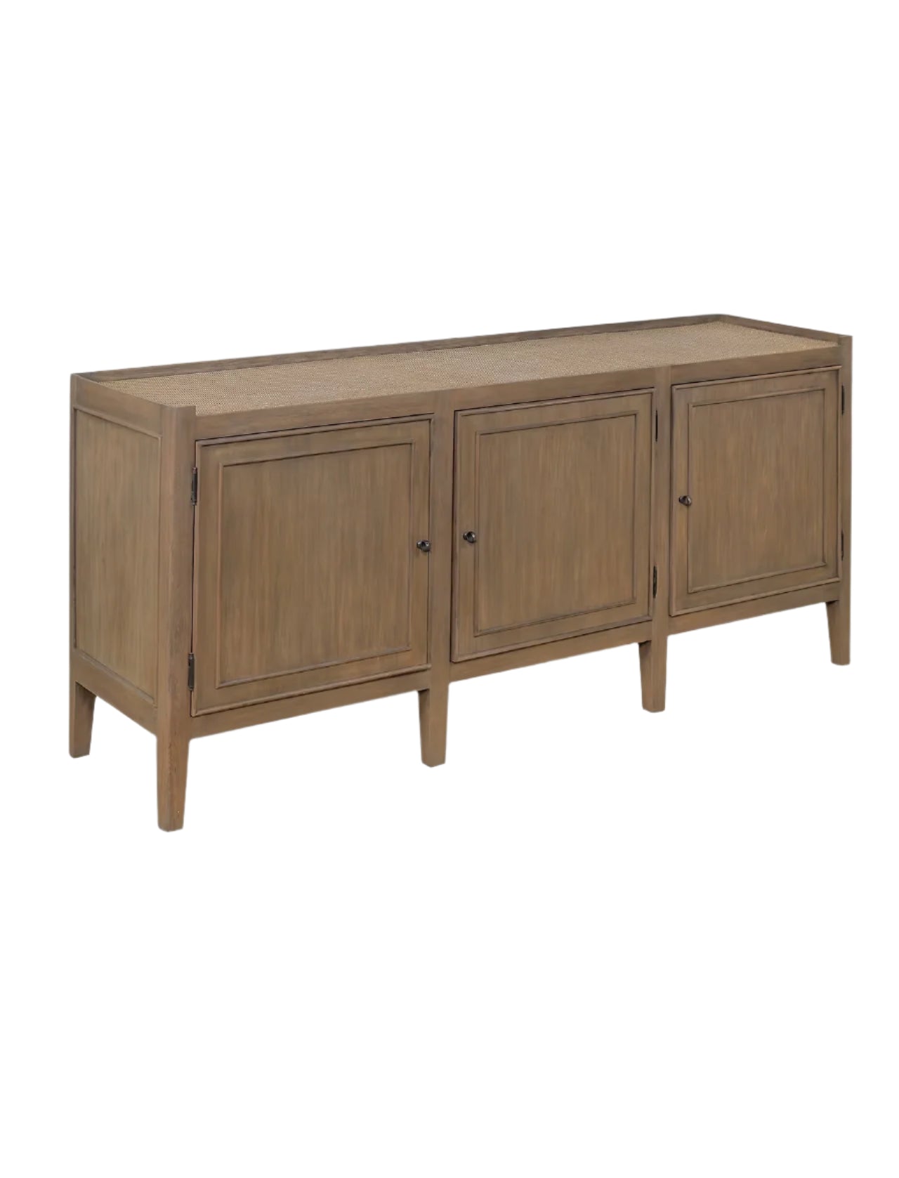 Expertly handcrafted from sturdy bayur wood with a refined mindi wood veneer, it showcases a warm, natural finish that enhances its elegant appeal. A distinctive wicker rattan top introduces texture and contrast, complementing the smooth wooden frame. Behind three beautifully panelled doors, generous storage space keeps essentials neatly organised, making it as functional as it is stylish.