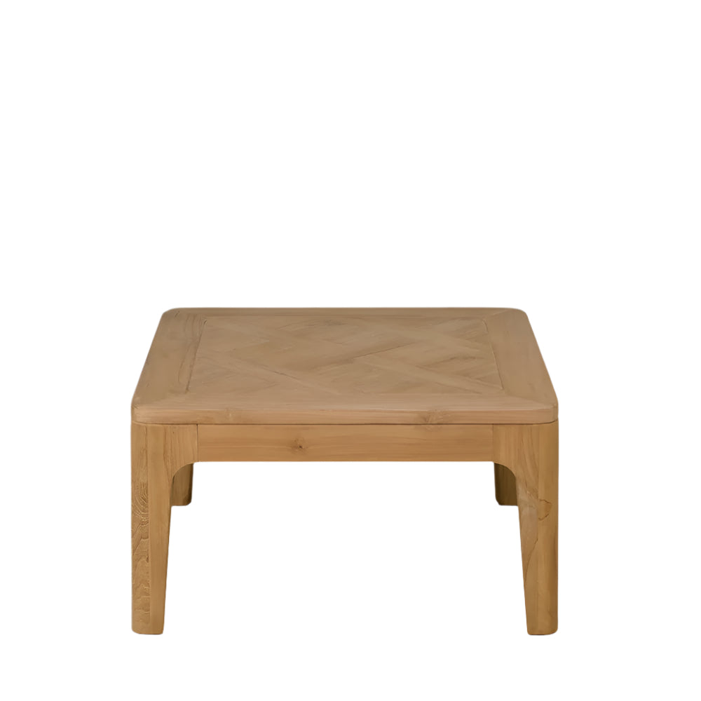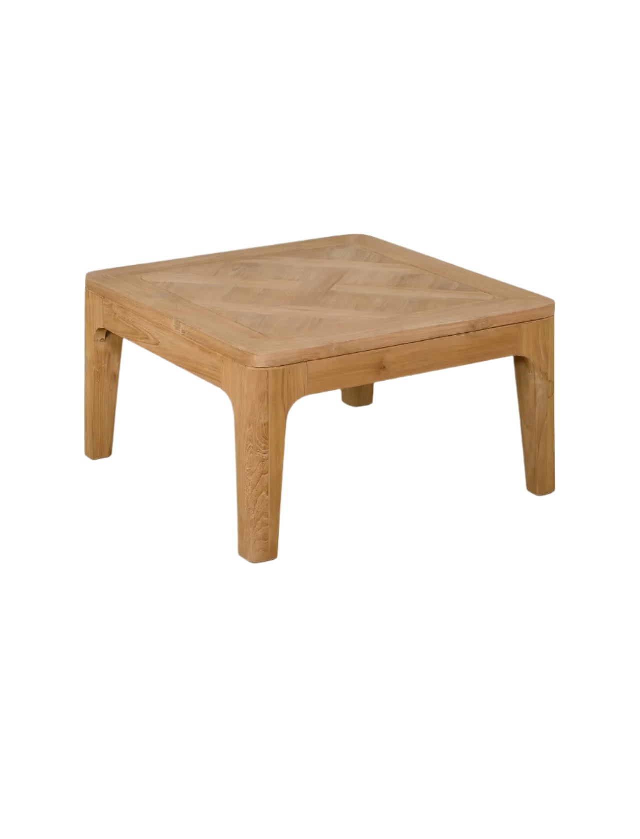 Crafted from recycled teak wood, its clean, angular lines create a timeless aesthetic that seamlessly complements both modern and rustic interiors. The standout feature is its subtle mosaic-like tabletop, which enhances the natural wood grain with depth and texture. Built for durability without compromising on elegance, this coffee table is perfect for everyday use while making a refined statement.