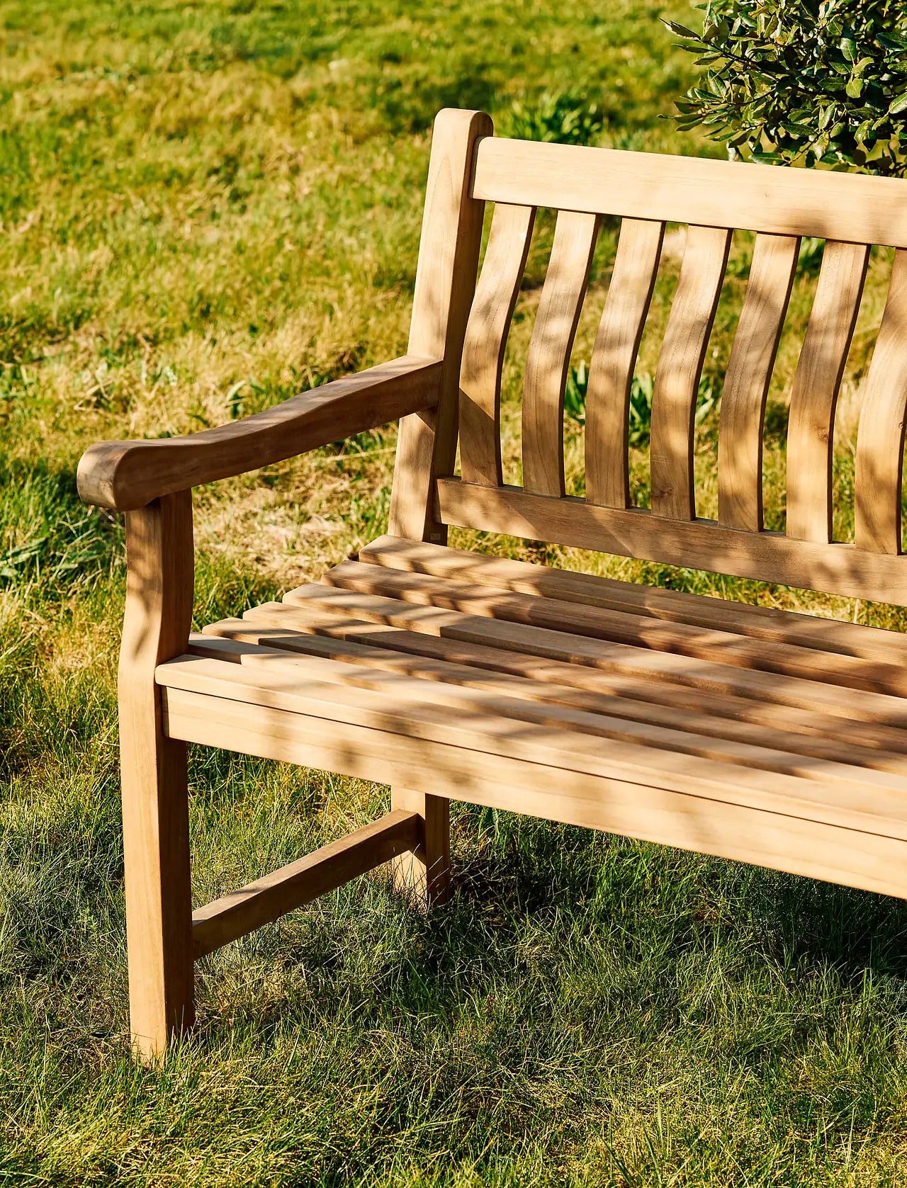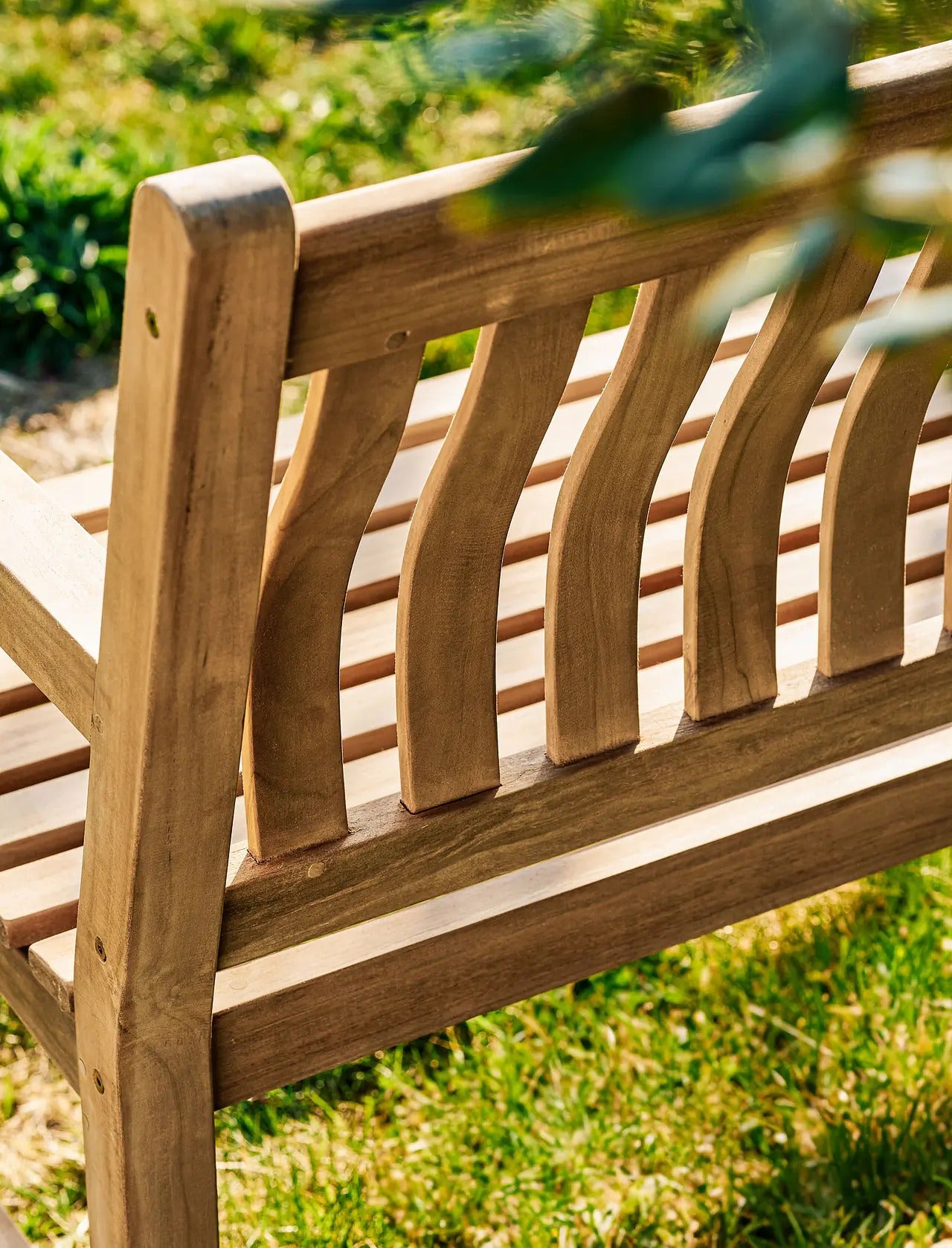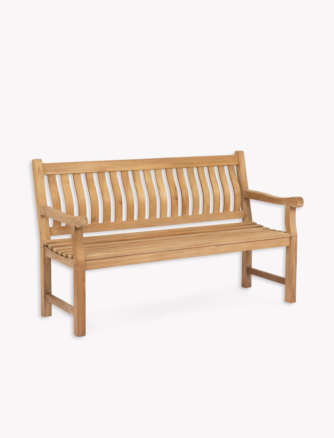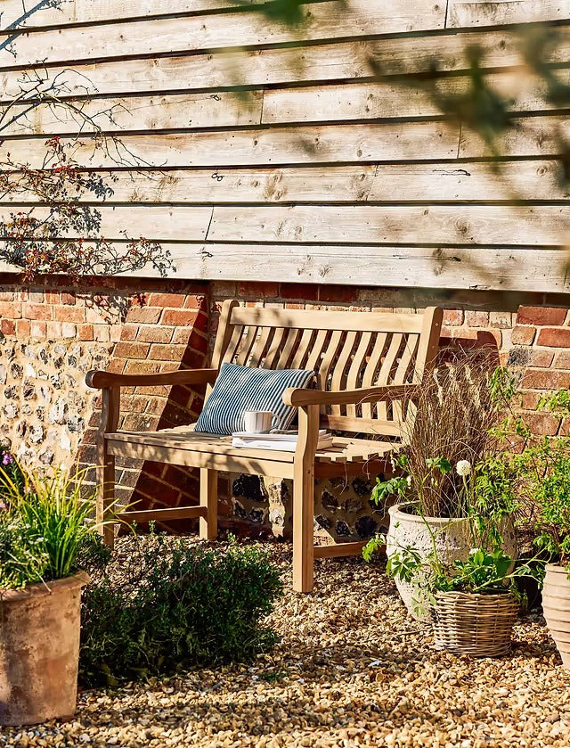 Crafted from solid teak, it features a gently curved slatted back and seat for ergonomic support, with sculpted arms that invite you to settle in and relax. Naturally weather-resistant with a beautiful grain, it’s built to stand the test of time. Add a throw or scatter cushions for extra cosiness.