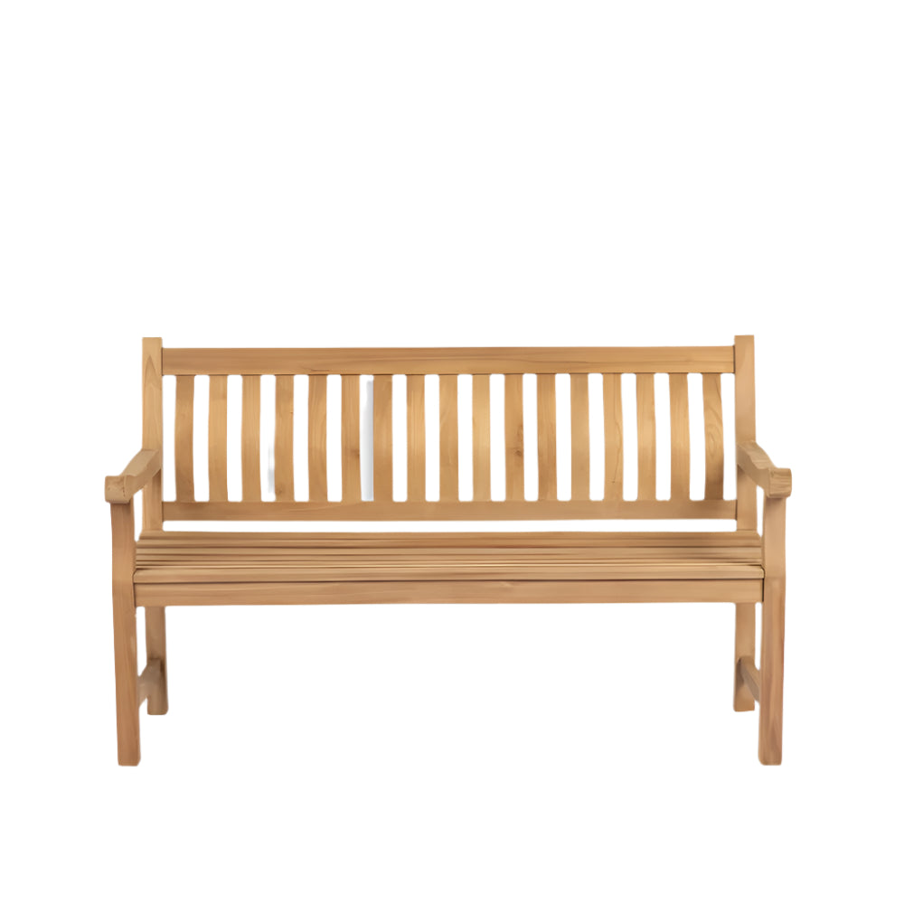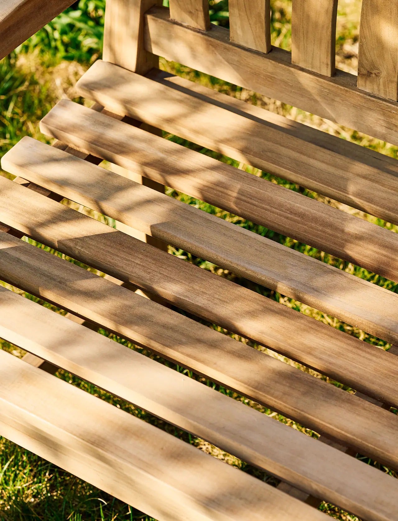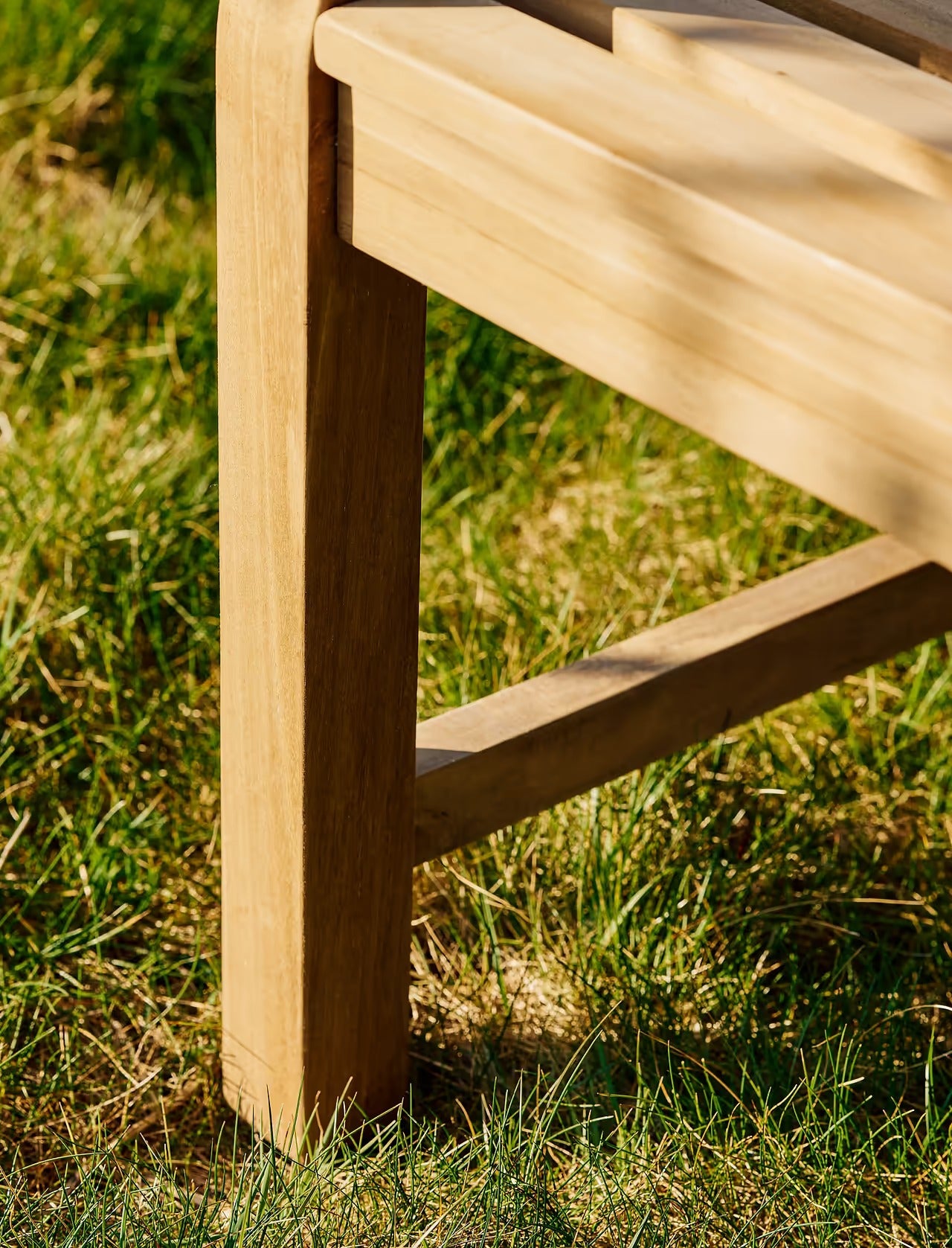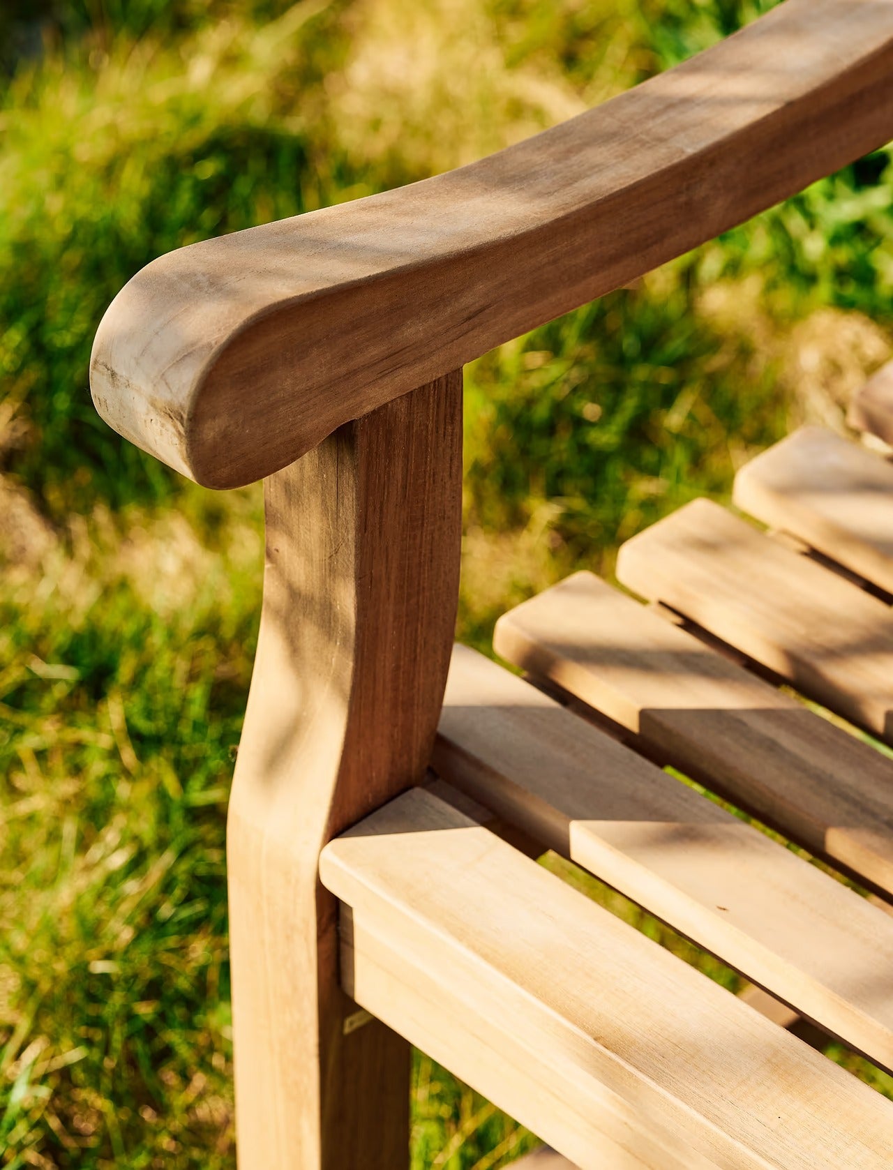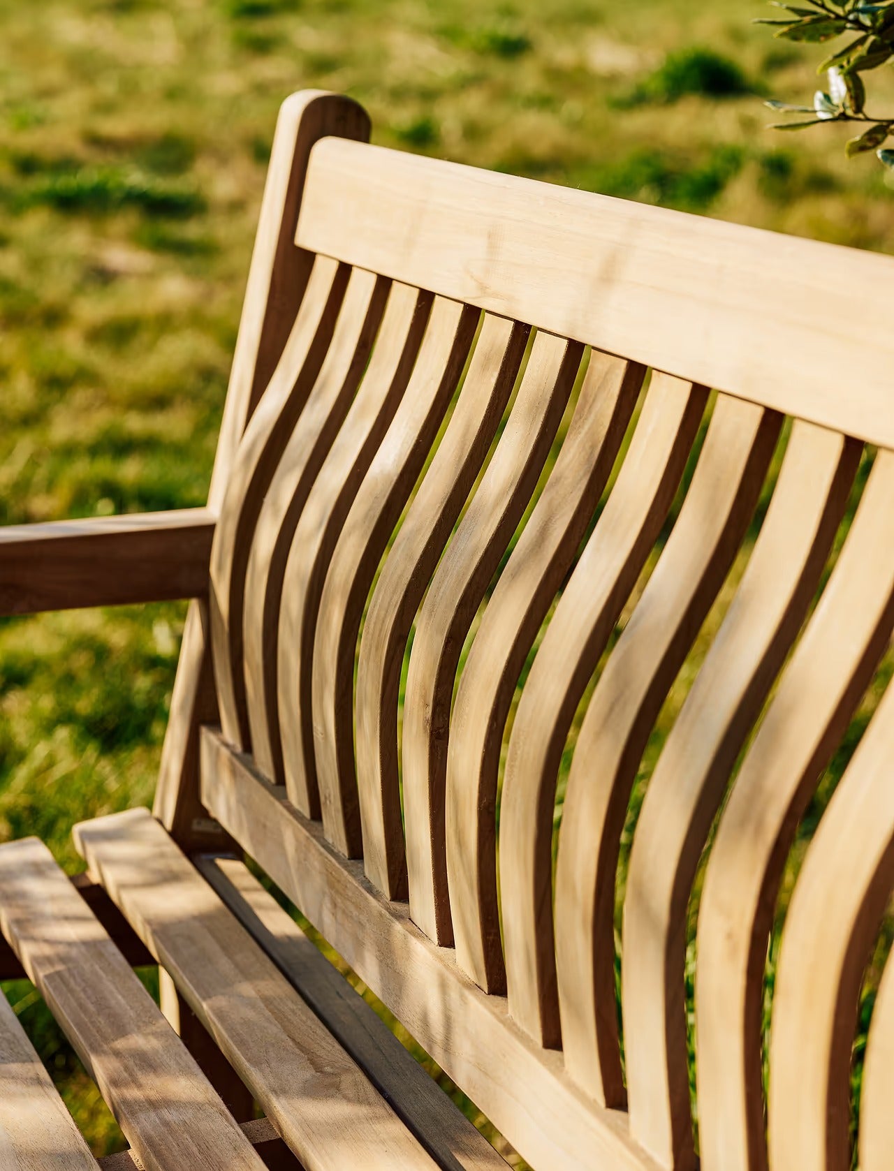 Crafted from solid teak, it features a gently curved slatted back and seat for ergonomic support, with sculpted arms that invite you to settle in and relax. Naturally weather-resistant with a beautiful grain, it’s built to stand the test of time. Add a throw or scatter cushions for extra cosiness.