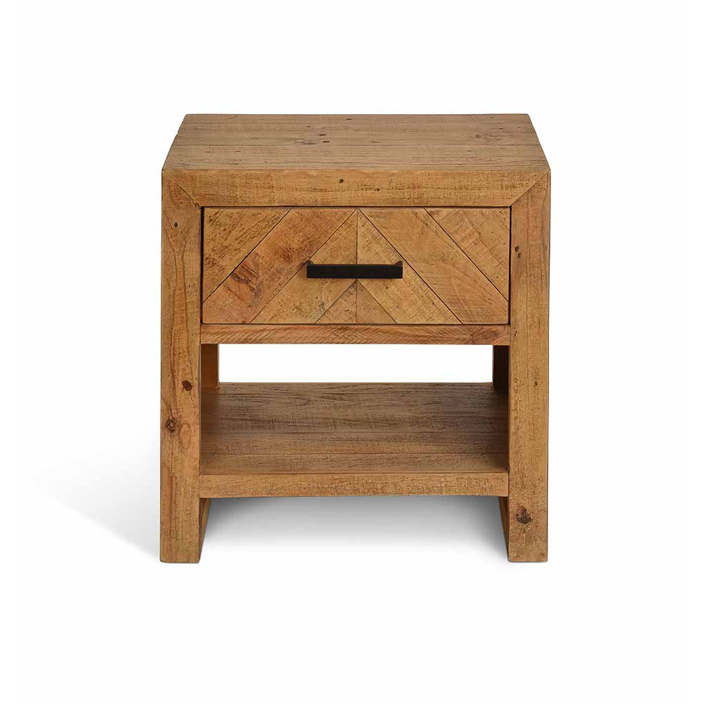 Crafted from reclaimed pine wood, it features a natural finish that highlights the innate beauty of the wood's grain. The single drawer, adorned with a striking chevron design, offers practical storage while adding visual interest. Below, an additional shelf provides extra space for your books or decor.