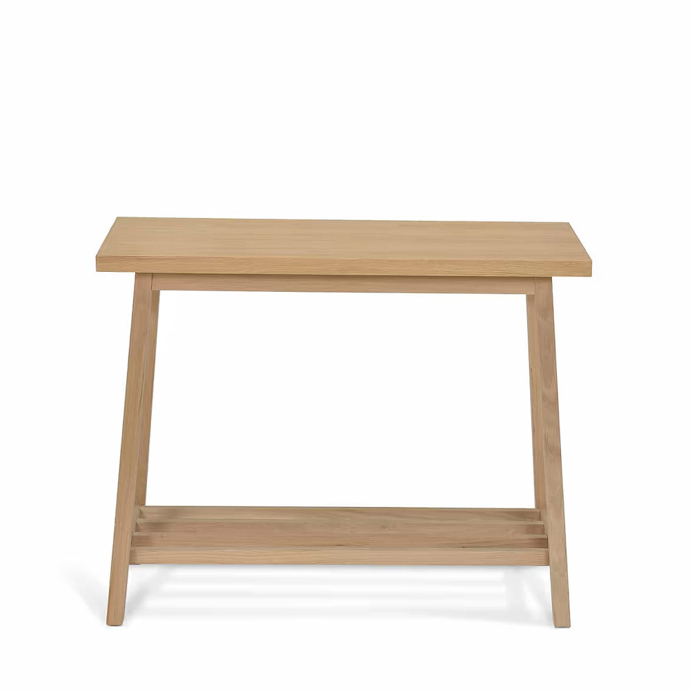 Crafted from solid oak with a warm, natural finish, it draws inspiration from Scandinavian design, showcasing a timeless, pared-back elegance. The smooth tabletop offers the perfect spot for keeping essentials like keys and wallets or for displaying ornaments, photos, and floral arrangements. A slatted lower shelf adds further functionality, providing convenient storage for baskets, shoes, or other items.