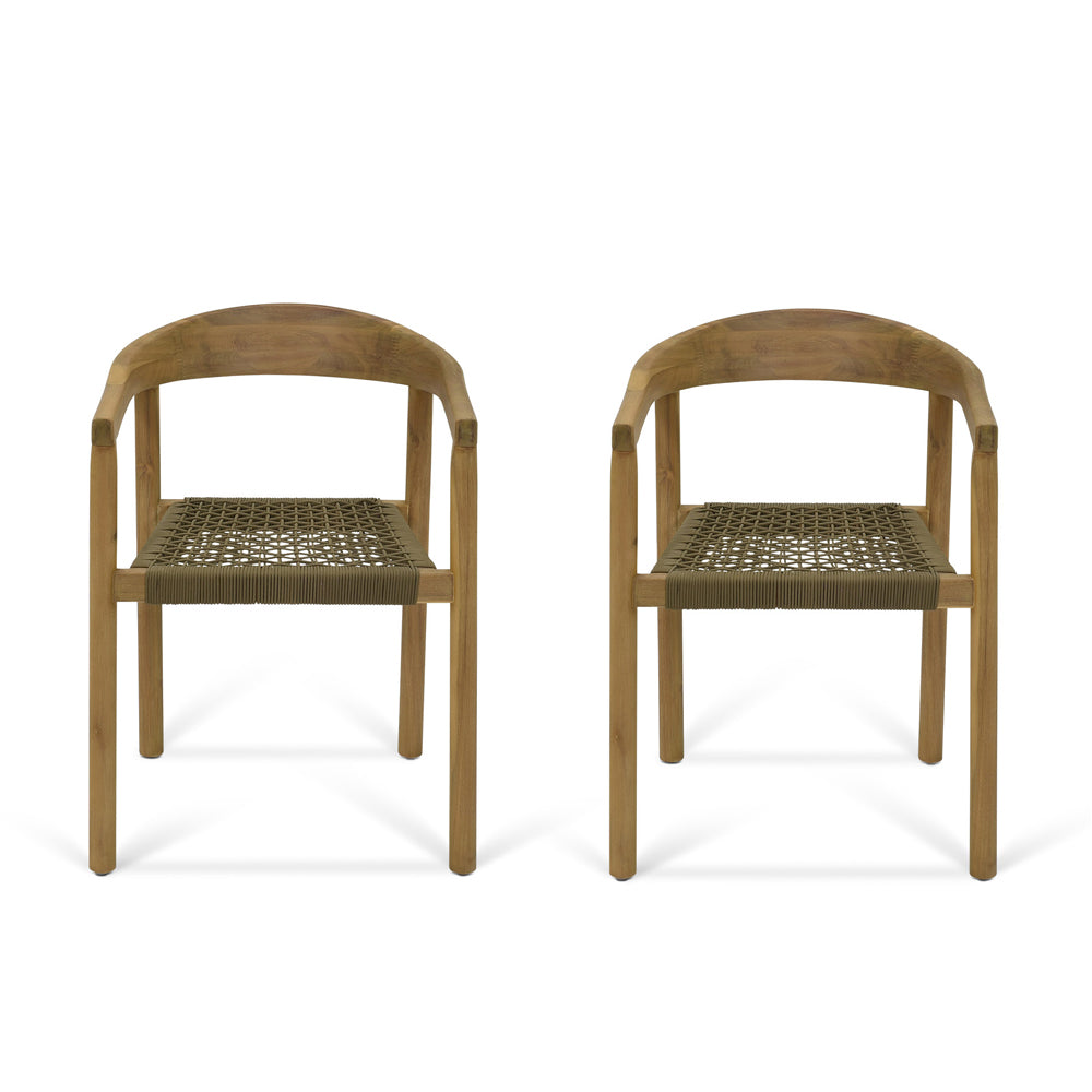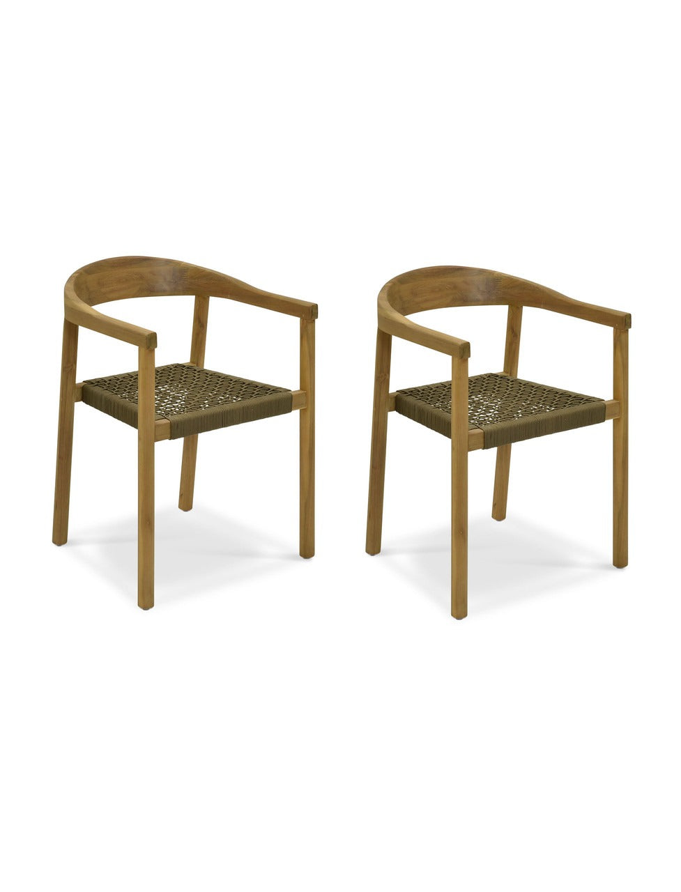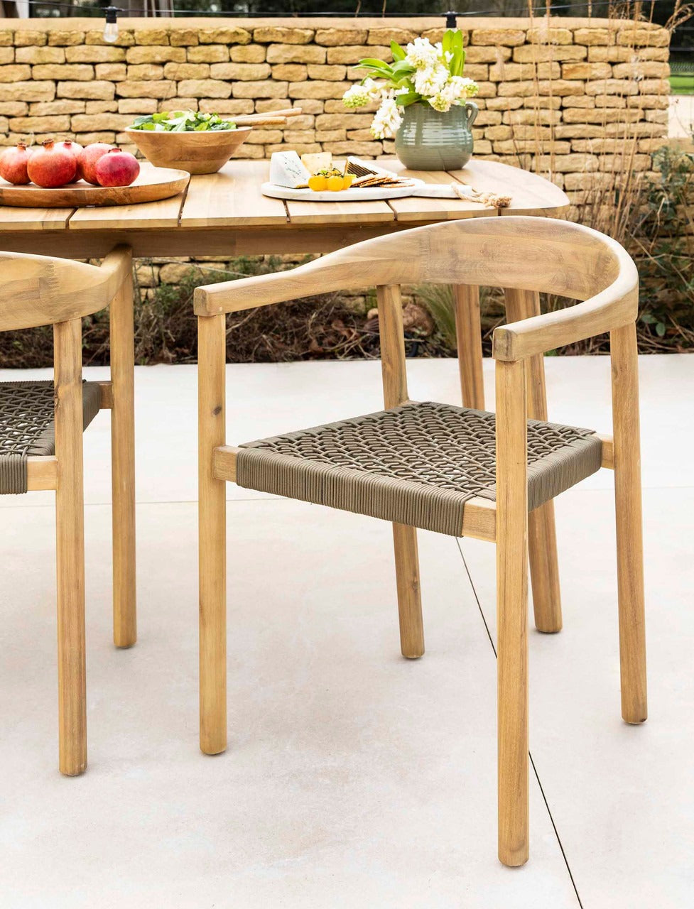 Designed to pair perfectly with the Harford Dining Table, these stunning chairs are crafted from weatherproof acacia wood, ensuring robust, long-lasting quality. A light teak stain accentuates their natural beauty, highlighting the exquisite grain, while the woven olive-green polyrope seat adds a subtle, stylish contrast.