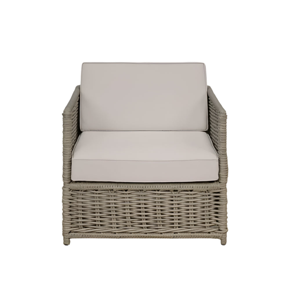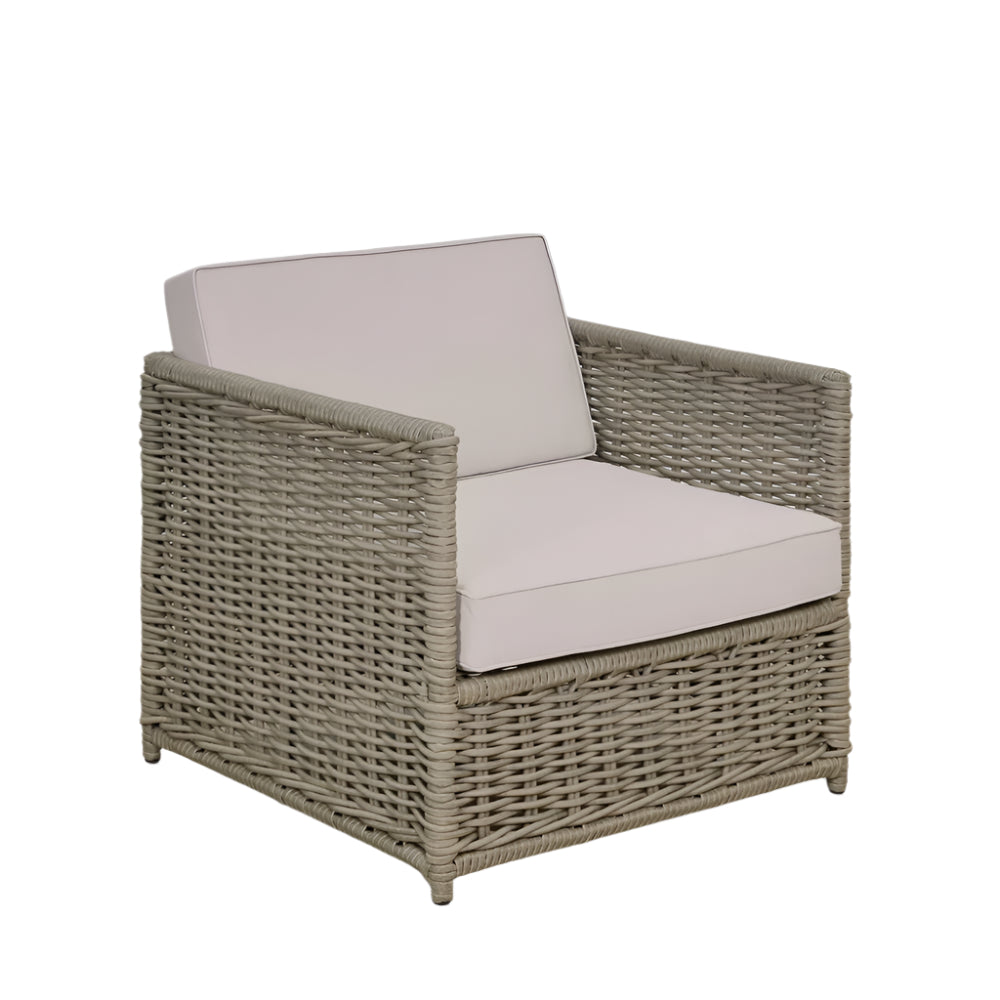 With its sleek silhouette and subtle coastal aesthetic, it’s perfect for moments of relaxed, laid-back lounging. Woven from durable PE rattan in a soft, natural tone, it captures the look of traditional wicker while offering excellent weather resistance. A plush, linen-style cushion enhances the seating experience and is showerproof for added practicality.