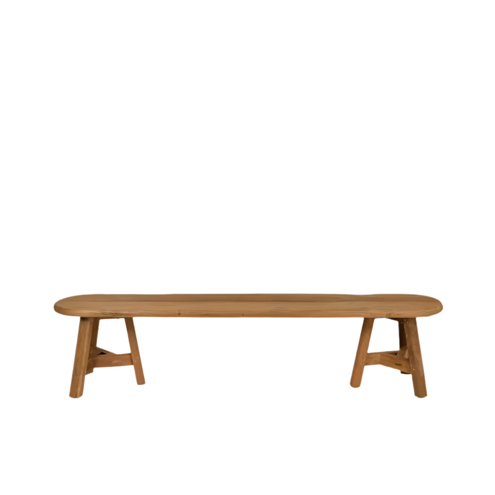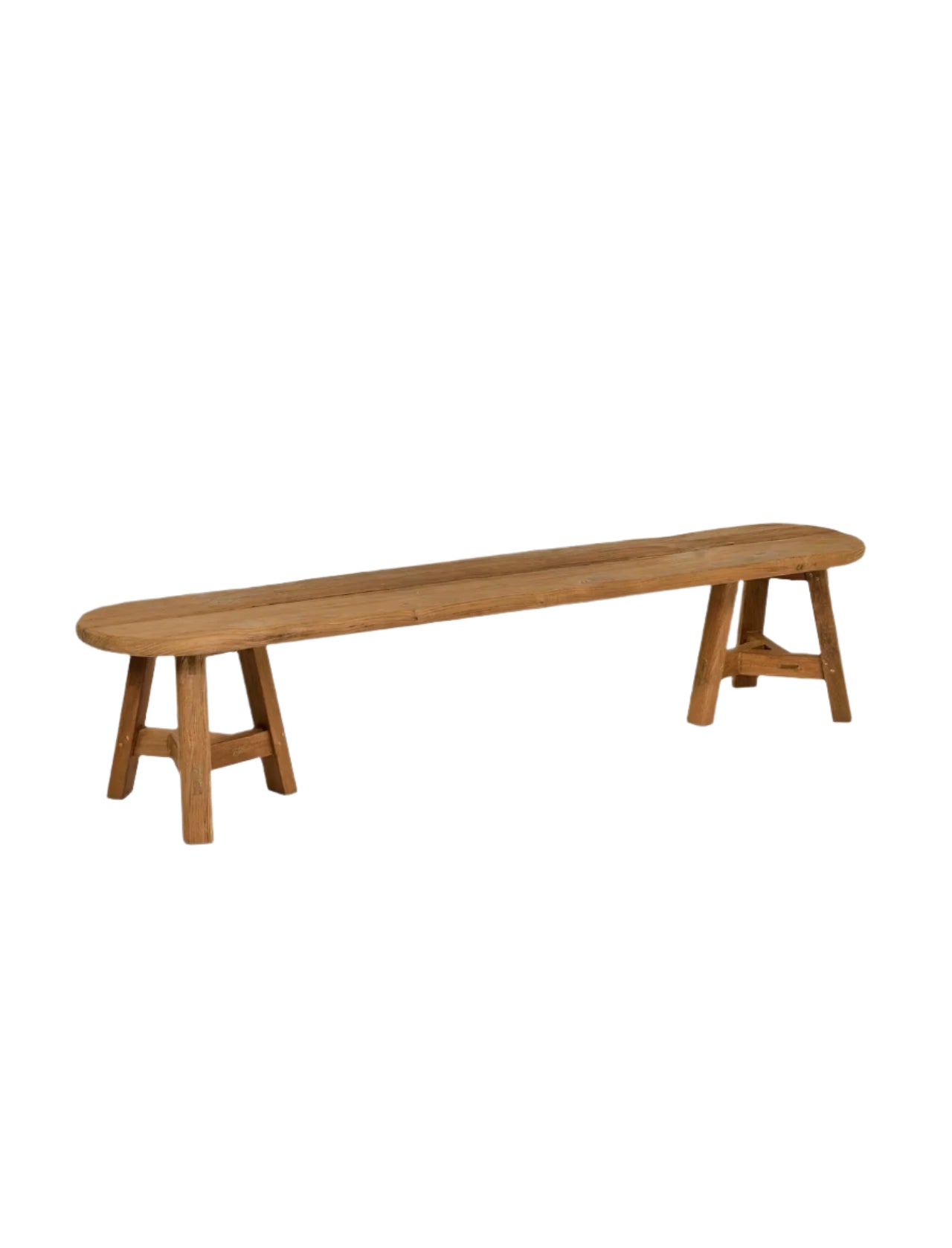 Made from reclaimed teak, it features a rich, natural grain that adds warmth and character. Its sturdy angular legs provide excellent stability, while the smooth, elongated seat offers generous seating for both indoor and outdoor dining.