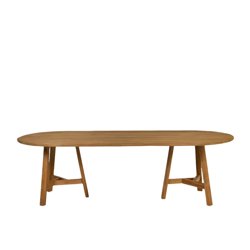 Crafted from reclaimed teak wood, its natural finish highlights the unique grains and textures, bringing warmth and character to your home. The sturdy, oval design creates an inviting atmosphere, ideal for cosy family meals or al fresco dining.
