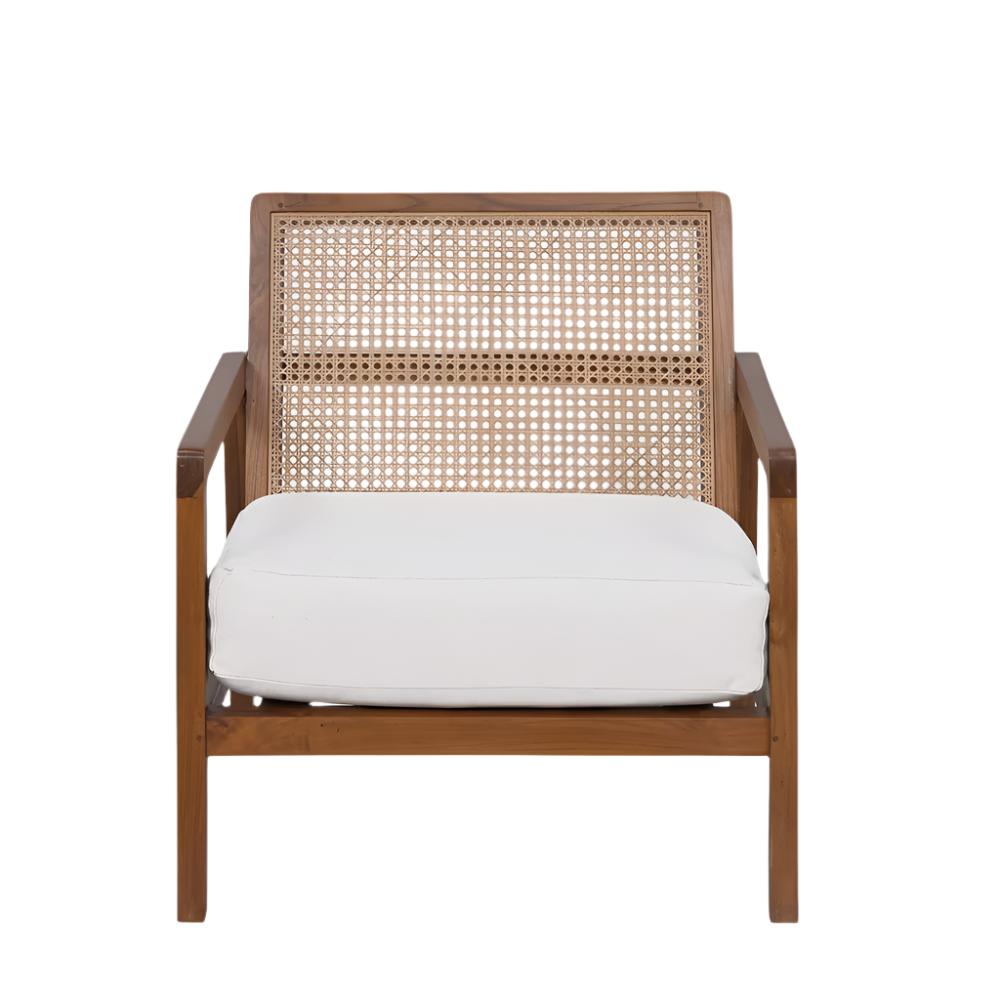 Boasting a sleek teak wood frame with a simple finish, its clean design is enhanced by a rattan back that imparts an almost tropical vibe. A plush cream seat cushion completes the look, providing both comfort and support while adding a subtle touch of sophisticated charm. For added versatility, both the seat cushion and its cover are removable for easy cleaning.