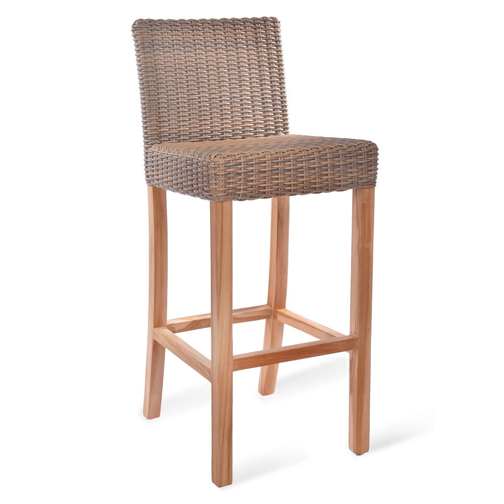 This stylish bar stool features elegant teak legs and a woven PE rattan seat and back which impart a subtle coastal-inspired charm. The high backrest and generously sized seat ensure comfort, making it a practical and stylish choice for everyday use.
