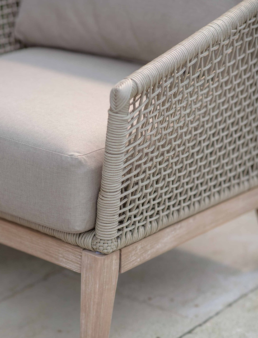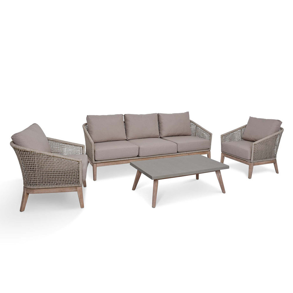 This comprehensive set includes everything you need for the perfect outdoor living space: a cosy three-seater sofa, two inviting armchairs, and a contemporary coffee table. Each piece showcases weatherproof acacia wood legs, ensuring durability and style. The seating features chic, woven rope construction, perfectly complemented by plush, neutral cushions for unmatched comfort whilst the coffee table is topped with sleek DuraCrete, adding a touch of sophistication.