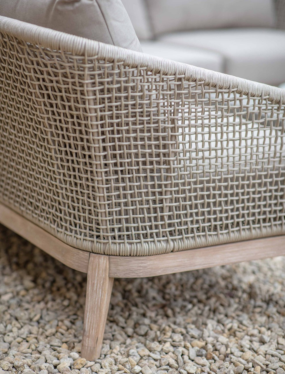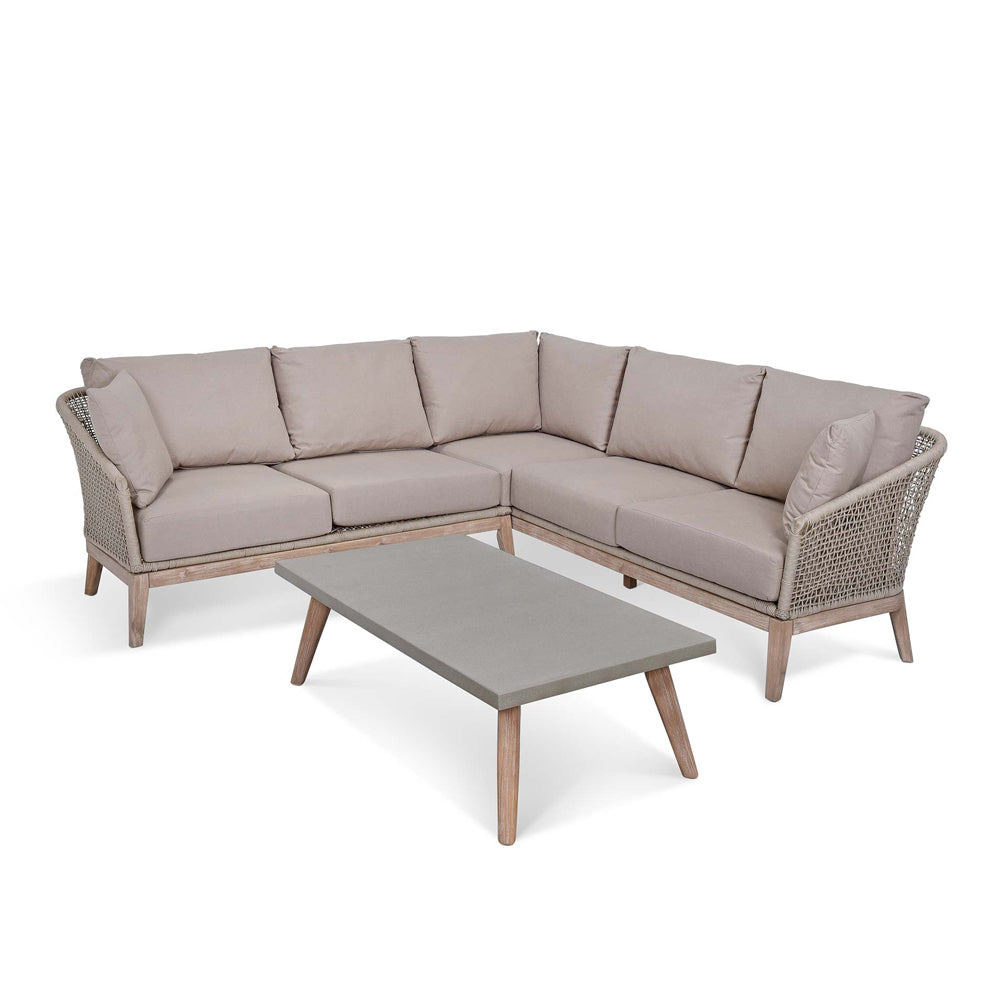 This comprehensive set includes everything you need for the perfect outdoor living space: a cosy corner sofa and a contemporary coffee table. Each piece showcases weatherproof acacia wood legs, ensuring durability and style. The seating features chic, woven rope construction, perfectly complemented by plush, neutral cushions for unmatched comfort whilst the coffee table is topped with sleek DuraCrete, adding a touch of sophistication.