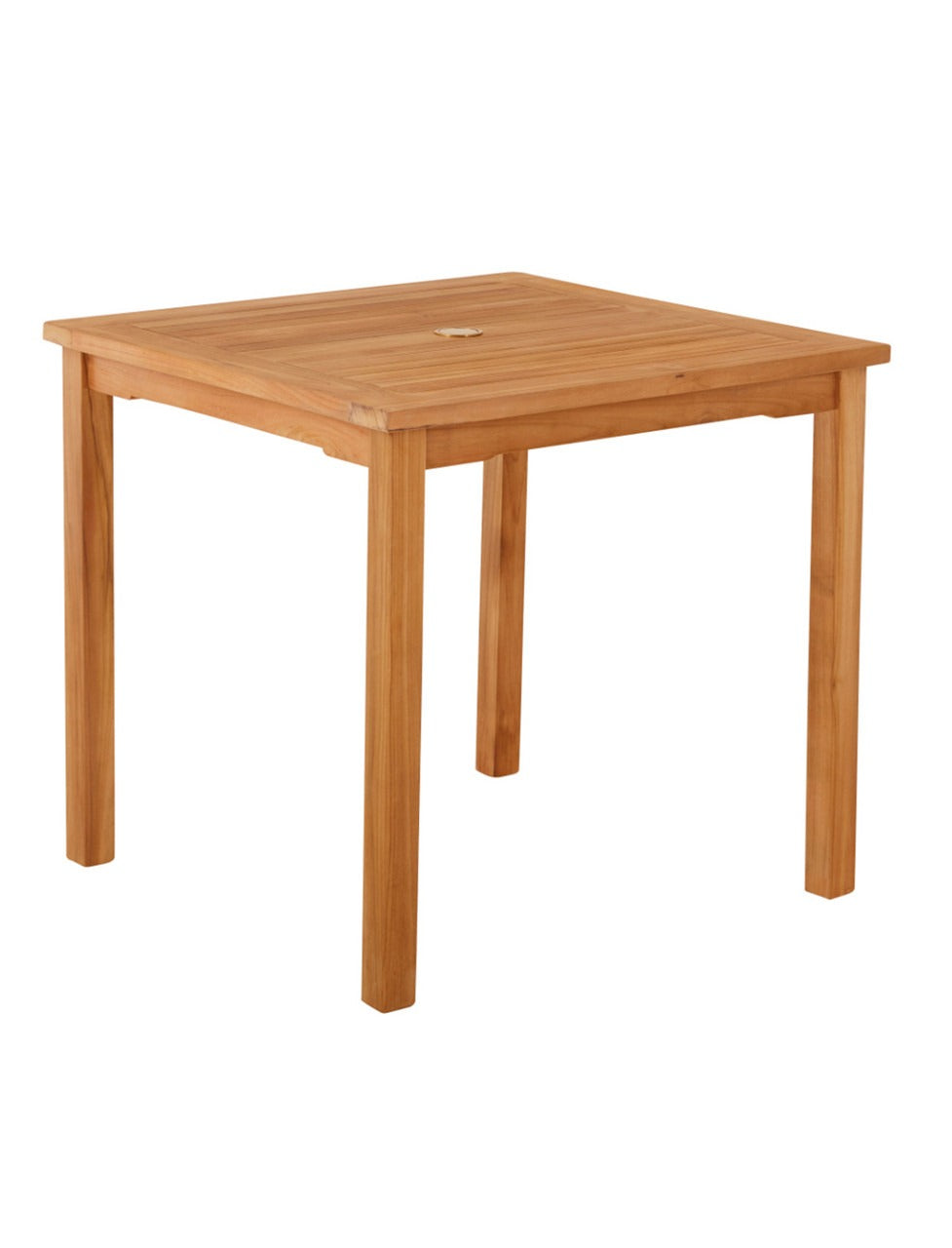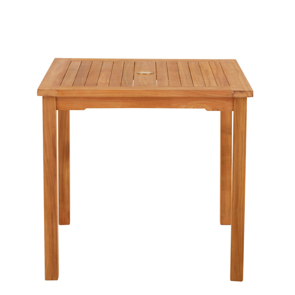 Crafted from solid teak, this robust table features a slatted top and an integrated parasol hole, ensuring durability and weather resistance. Its compact size is ideal for smaller gardens and patios, providing a cosy spot for intimate gatherings.