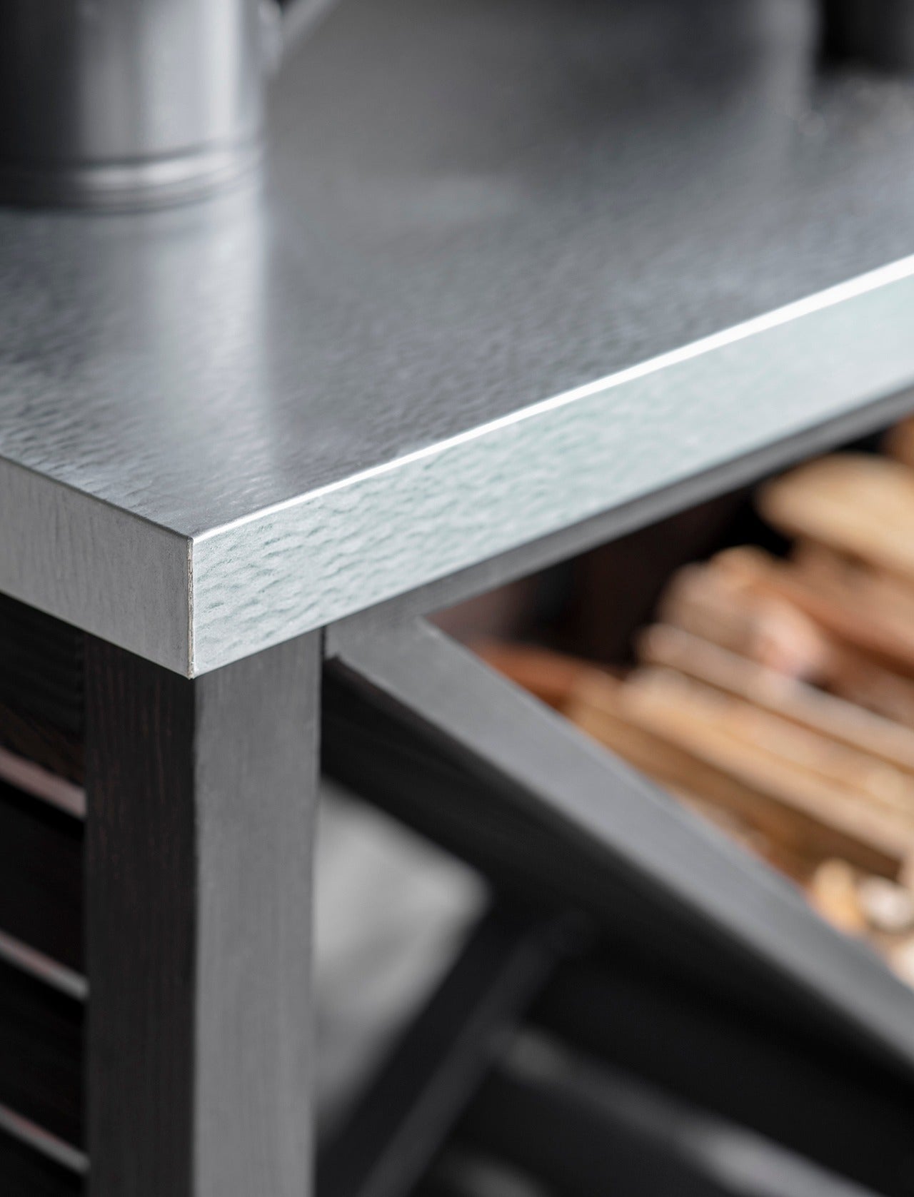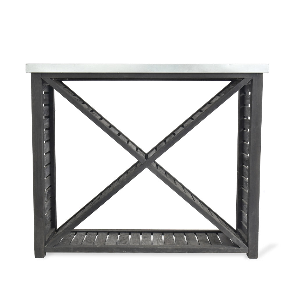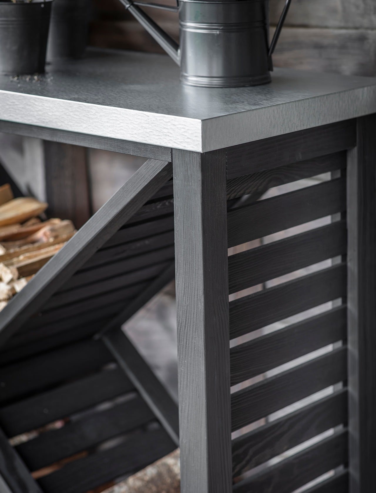 Expertly crafted from durable spruce wood with a sophisticated black finish, it exudes modern style with a touch of rustic charm. Its robust metal top serves as a versatile shelf, ideal for storing kindling, tools, or adding decorative flair. Featuring striking cross-detailing and an understated yet refined design, it is a chic, practical solution for any home.