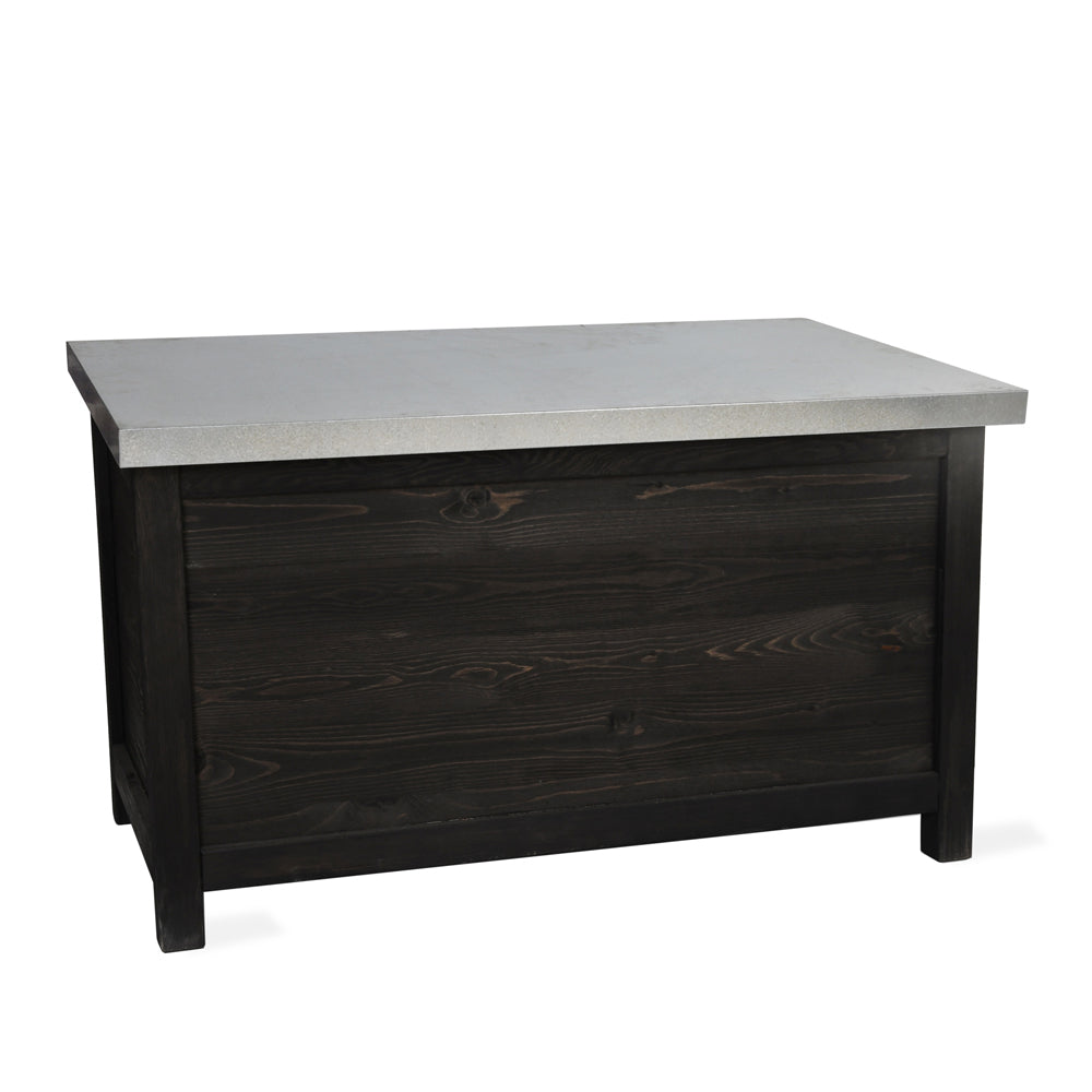 Crafted from spruce with a sleek black finish, its weatherproof design features a hinged, slanted lid made from galvanised sheet metal to allow rainwater runoff. The lid's silver sheen contrasts perfectly with the black wood for a stunning result. Inside, there's ample space to stash gardening tools, cushions, or toys, keeping them protected from the elements.