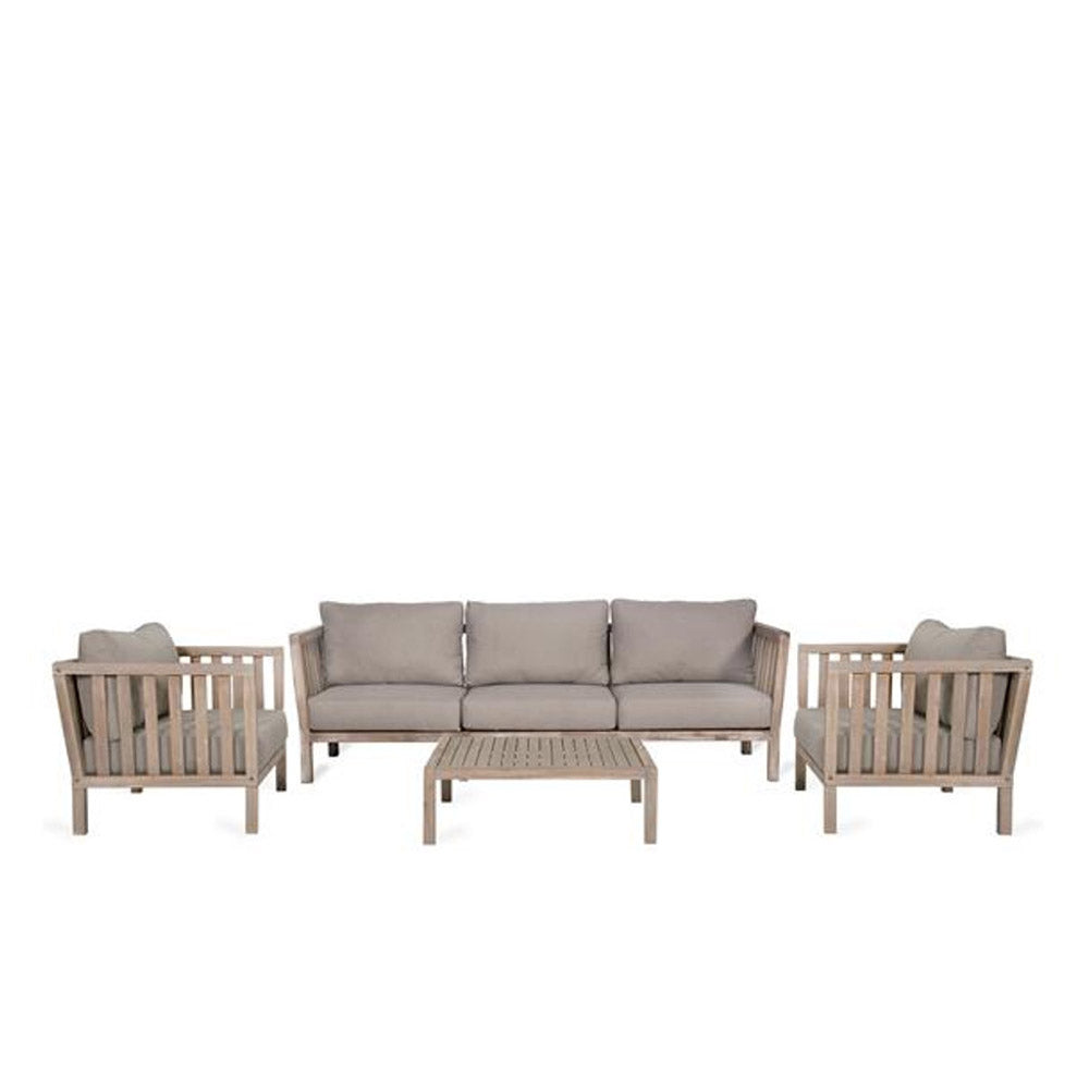 Crafted from whitewashed acacia wood, this set boasts a timeless design that seamlessly complements any garden or patio. It includes a spacious three-seater sofa, two cosy armchairs, and a sleek coffee table—ideal for alfresco lounging. The soft grey cushions provide comfortable, inviting seating while enhancing the understated charm of the wood frame.