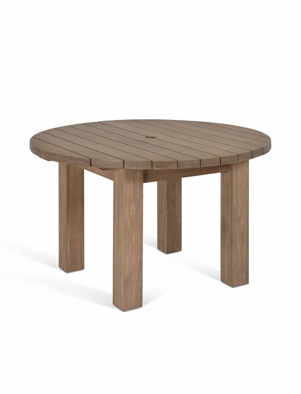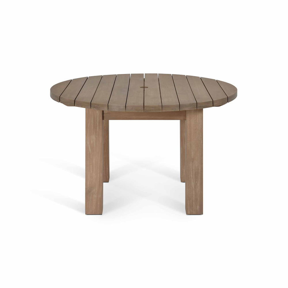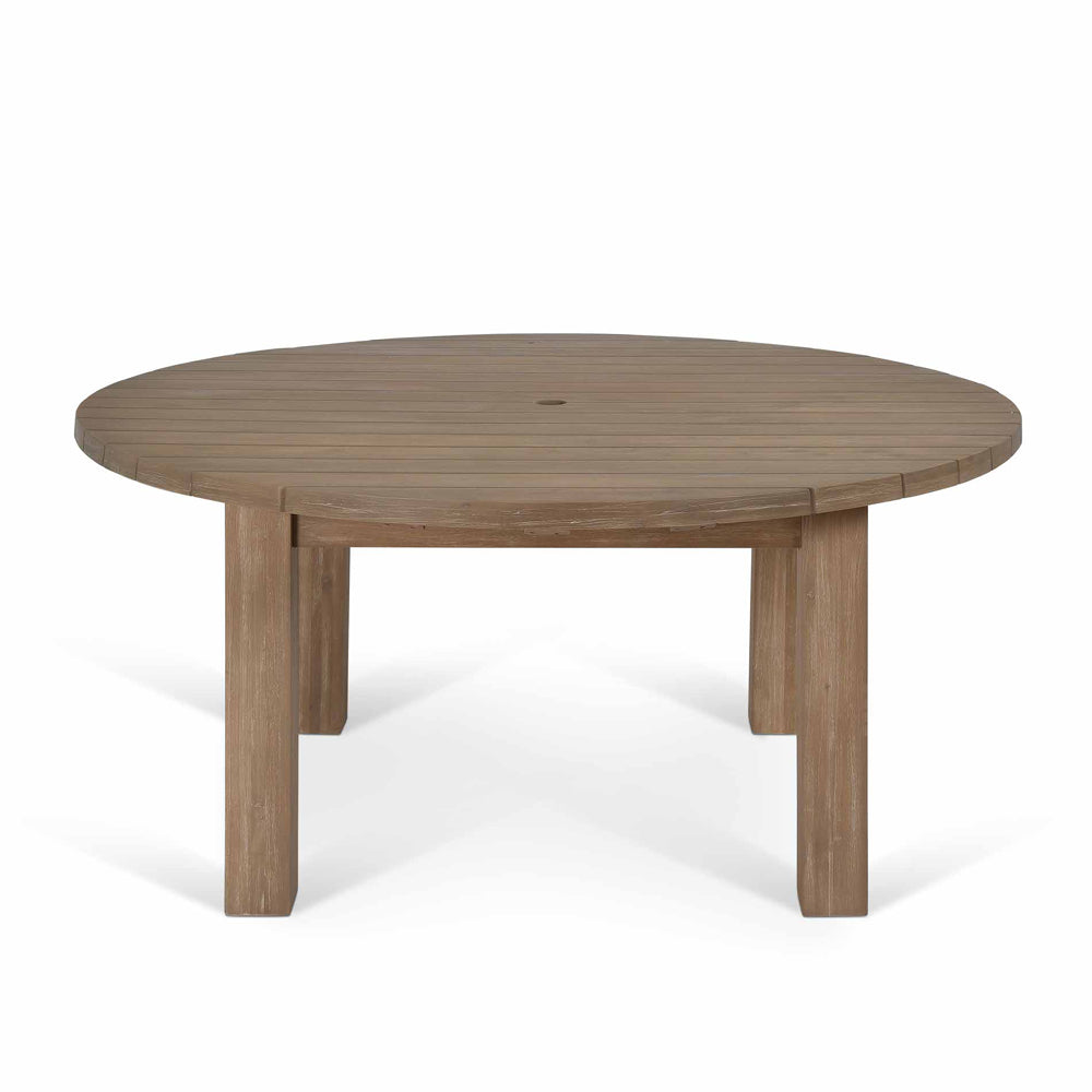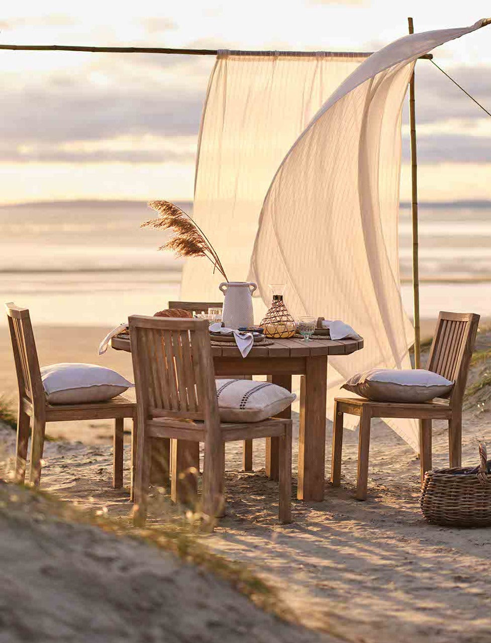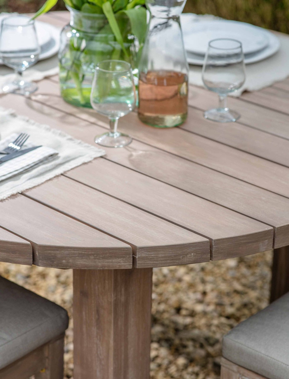 Made from durable acacia wood, its oak wash finish showcases the wood's natural allure, complemented by a slatted top that adds an extra touch of elegance. It even has a central hole for slotting in a parasole making it ideal for those cherished gatherings in the sun. Pair it with matching dining chairs or armchairs to complete a stunning outdoor dining set.