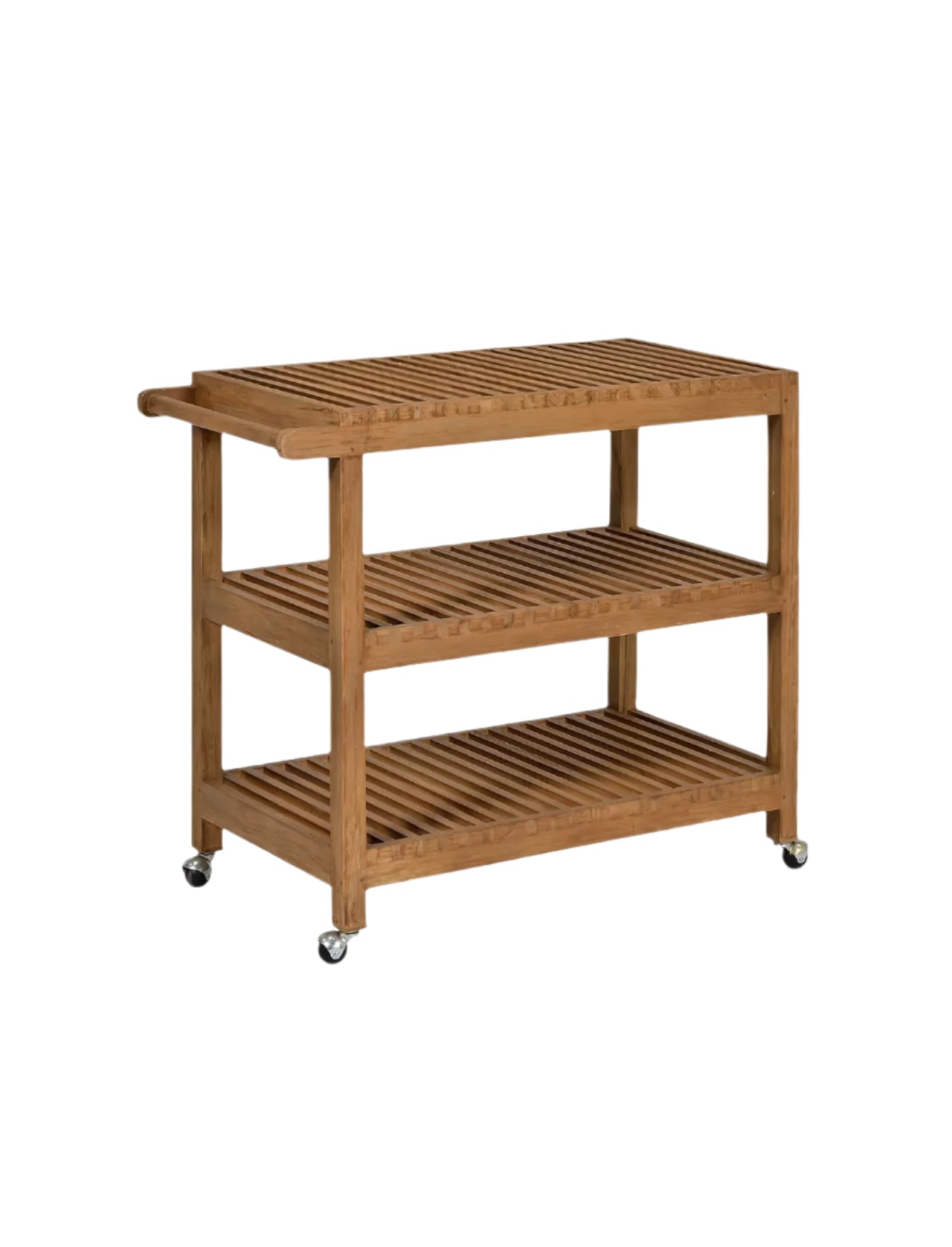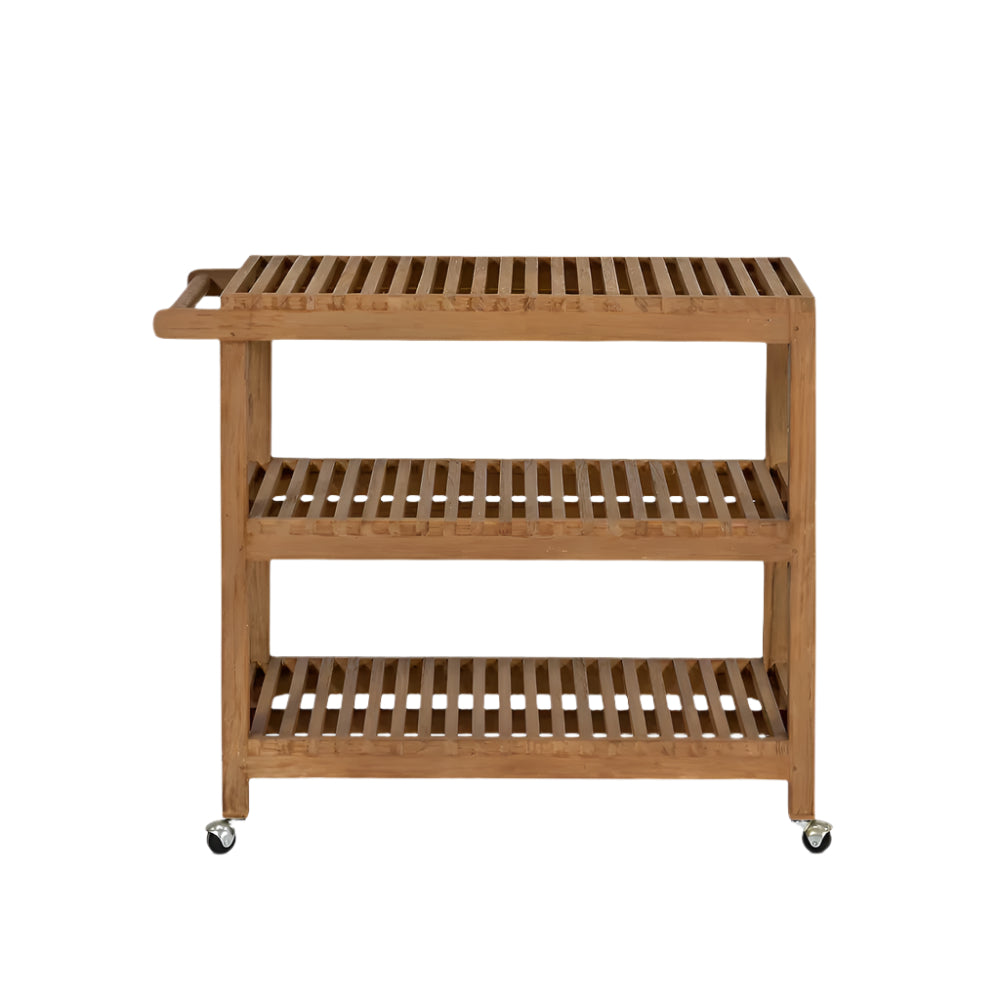 Designed for practicality, it features four castor wheels for easy manoeuvrability, while the slatted teak wood construction prevents moisture buildup. The warm antique wash finish enhances the natural wood grain, making it a seamless fit with rustic, modern, or Scandinavian-inspired interiors. With three spacious tiers, it offers ample storage for cookware, tableware, or decorative accents, combining function with elegance for a flawless result.
