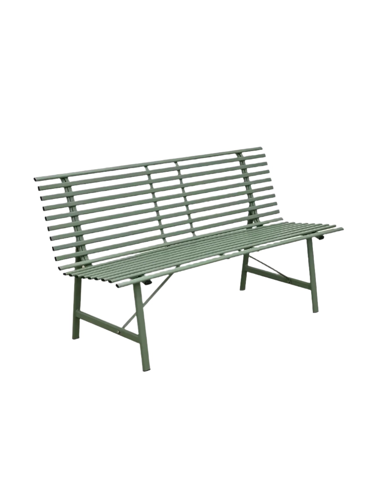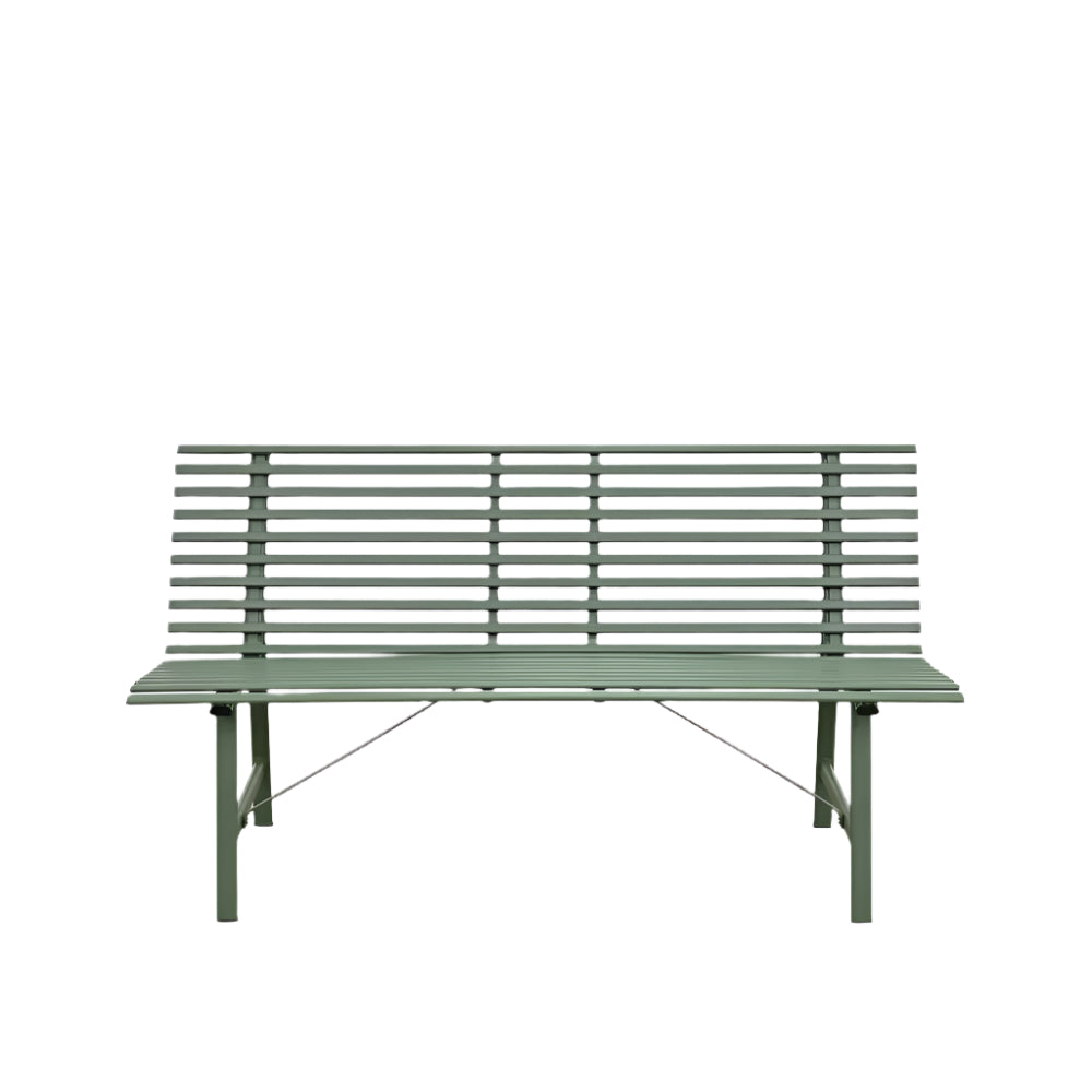 This elegant piece is made from green powder-coated steel, offering both a sleek aesthetic and enduring robustness. Its distinctive slatted design captivates at first glance, establishing the bench as a remarkable addition to any garden or patio.