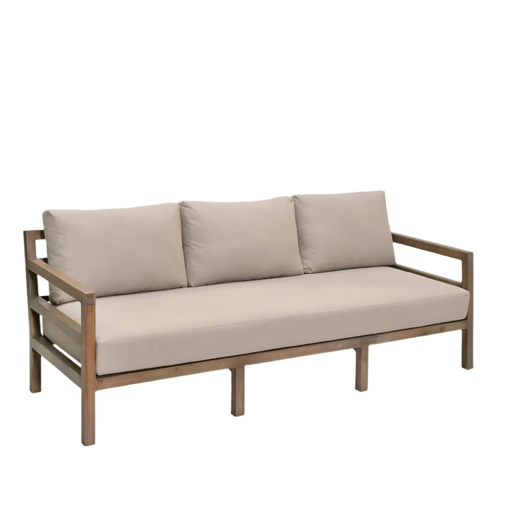 Crafted with a sturdy acacia wood frame, its clean lines and natural finish showcase the beauty of the wood grain and expert craftsmanship. The thick, padded seat and back cushions, in neutral, removable, showerproof fabric, provide exceptional comfort without compromising its sleek aesthetic.