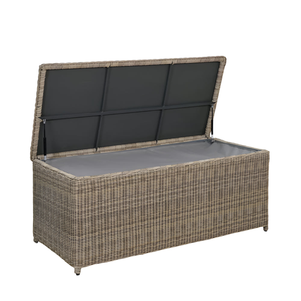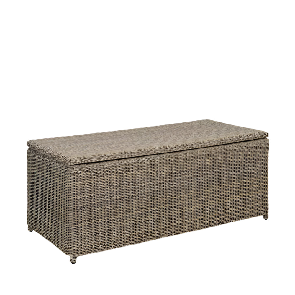 Handwoven from durable PE rattan over a sturdy aluminium frame, it offers both strength and a timeless, natural look. The gas strut soft-close lid allows for effortless access, while the fully lined, zipped showerproof fabric helps protect contents from the elements.