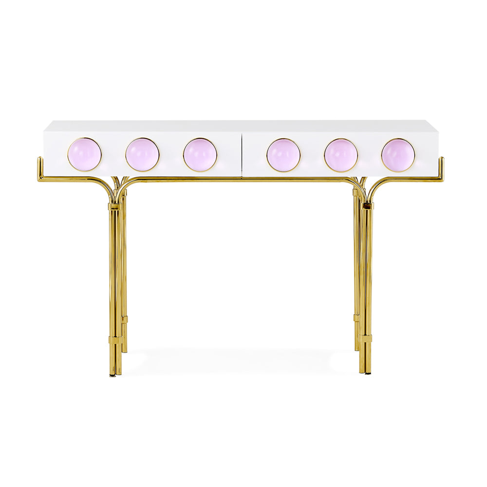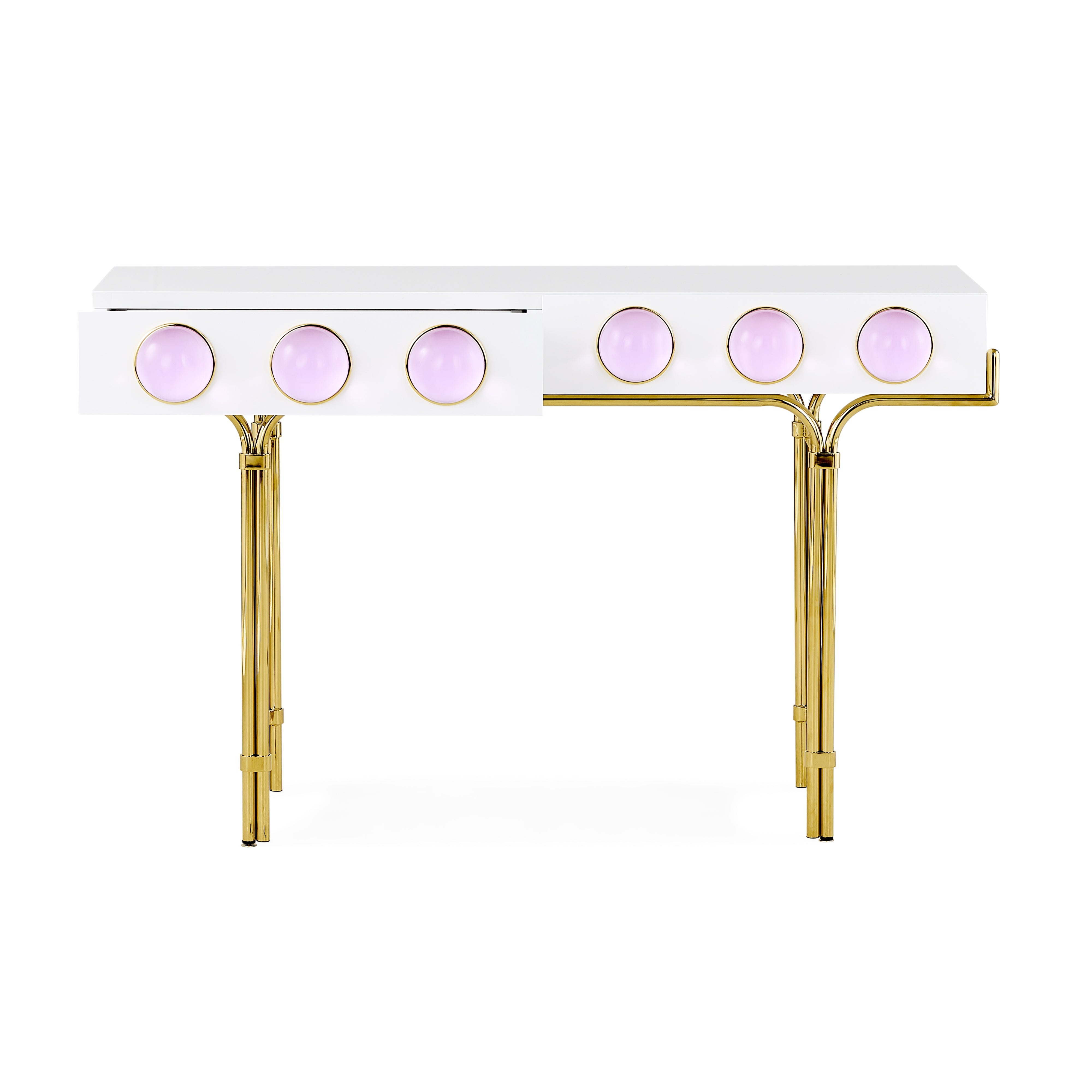 This stylish console stands on a gleaming brass frame, its subtle curves adding a touch of elegance. Its body is a white lacquer cabinet with a glossy finish, punctuated by solid pink acrylic cabochons that lend an extra flair of style. With two soft-slide drawers, it offers practical storage solutions to keep your space organised and the top is perfect for showcasing your favorite ornaments and photographs.