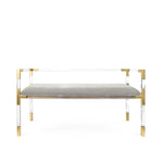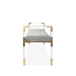 It features a clear acrylic frame for an airy, elegant look, while the bold brass metal accents add a touch of luxury and sophistication. Upholstered in sumptuous Rialto Smoke velvet, the bench provides both comfort and style, making it a versatile piece for any space.