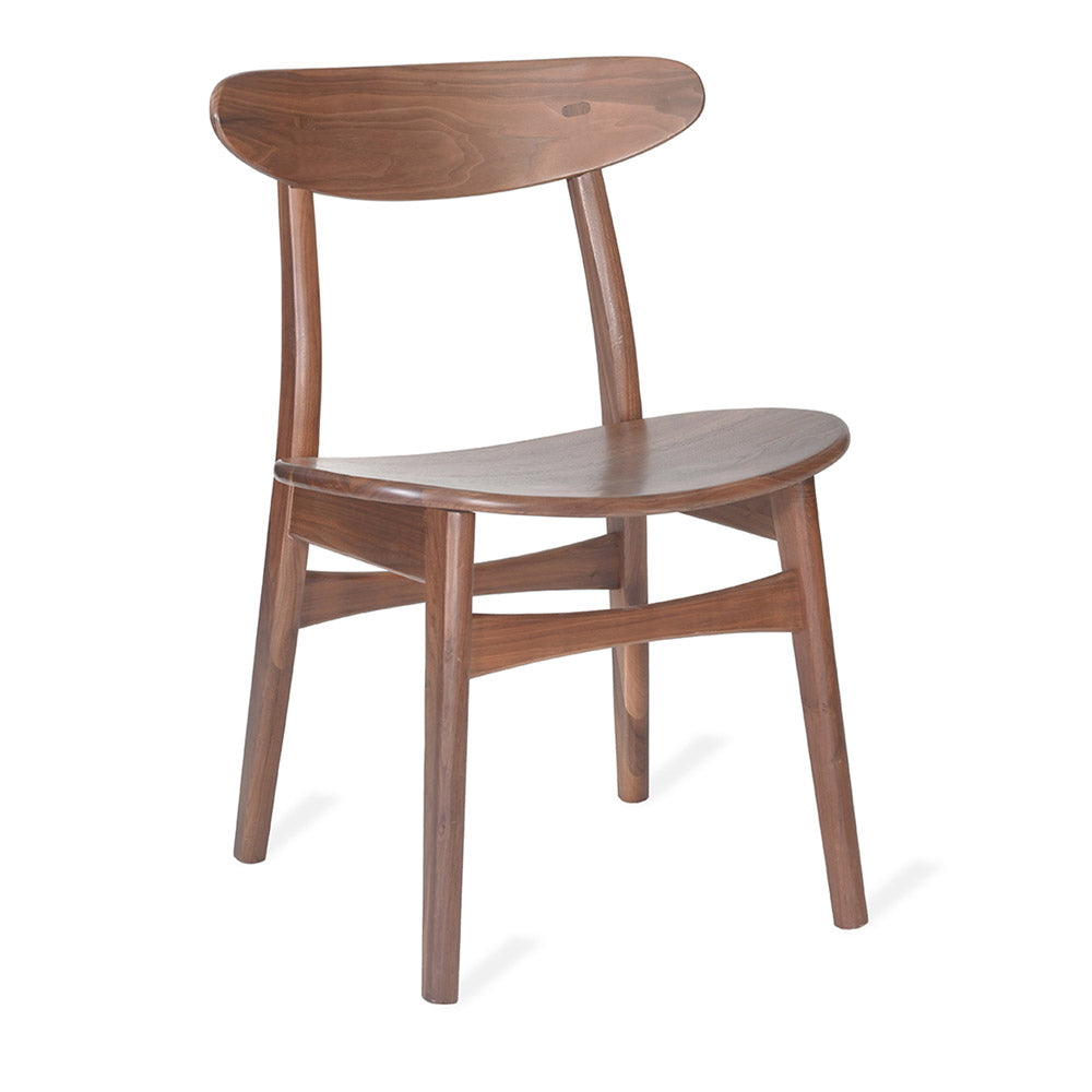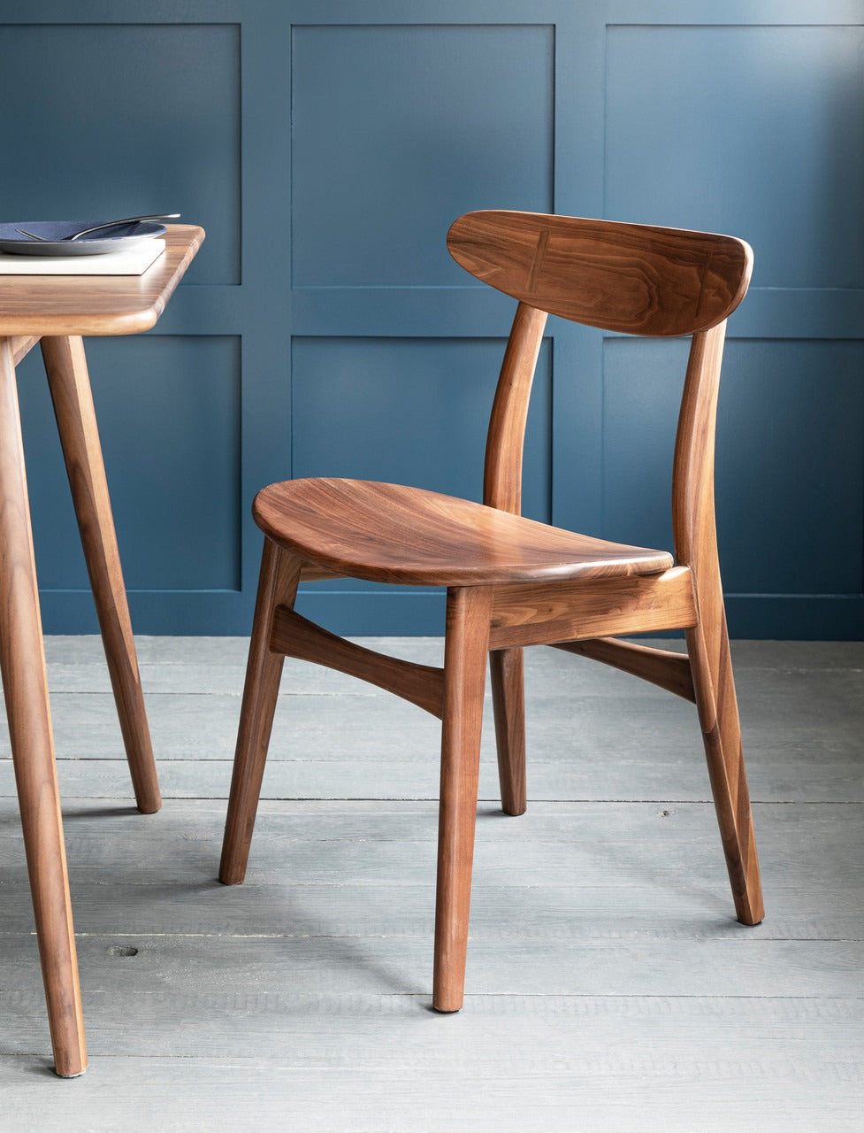 Crafted from luxurious walnut, these chairs feature a gently curved backrest and a smooth, sculpted seat that provides ergonomic support. The tapered legs echo the table’s minimalist style, creating a cohesive and polished look for your dining area. With mid-century modern influence, these chairs offer timeless appeal, suiting a range of interiors.