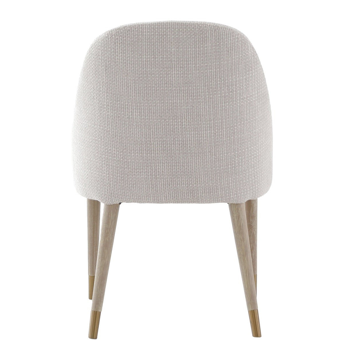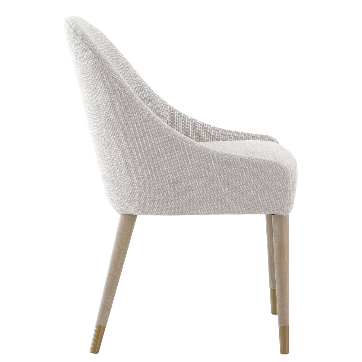 Designed with soft, sweeping curves and a supportive silhouette, this elegant chair brings inviting refinement to any dining space. The neutral, tactile upholstery adds texture and warmth, beautifully complementing the pale wooden legs finished with refined brass‑capped detail. Its versatile style fits effortlessly into both modern and classic interiors without compromising on comfort or sophistication.