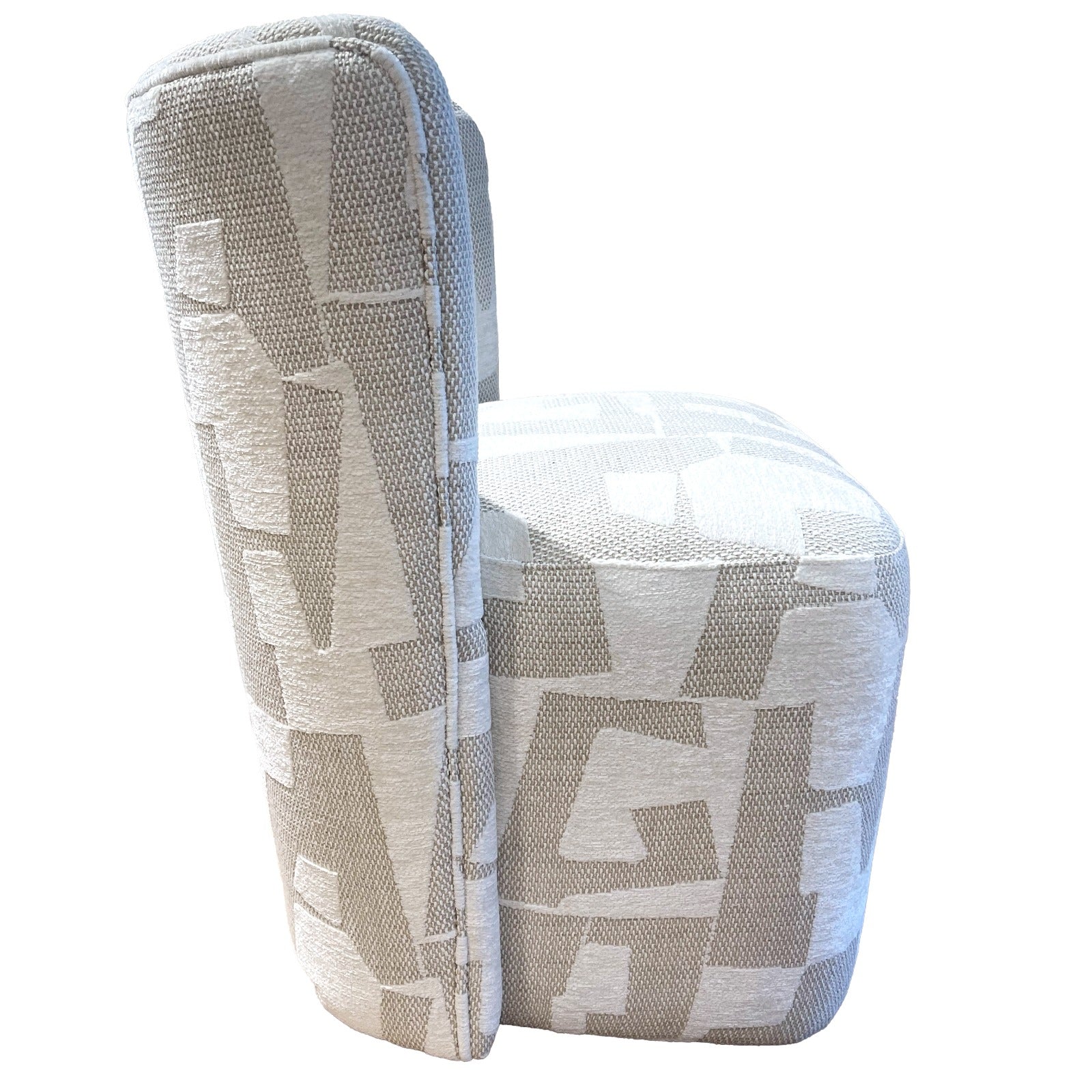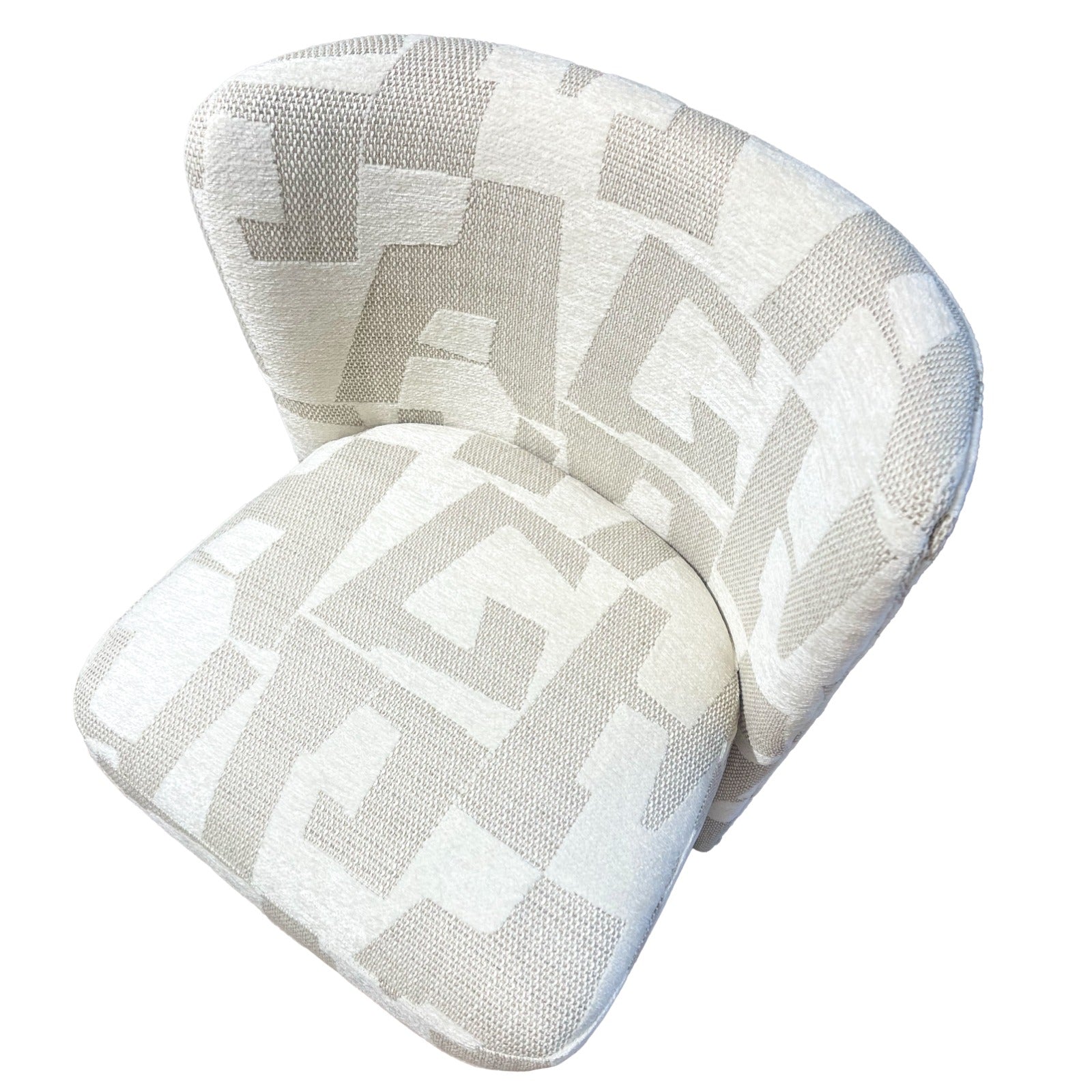Defined by clean lines and smooth curves, its sculptural form is upholstered in textured, neutral‑tone fabric that suits both modernist and postmodern interiors. The curved, armless silhouette creates a cocooning feel, while the built‑in swivel mechanism allows for easy movement and relaxed conversation around the table.