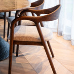 Blending subtle mid-century and Scandi influences, each chair features a sinuous frame of clean lines, smooth curves and warm brown tones for an artisanal look and feel. Rich, tactile upholstery in a neutral mocca shade adds comfort and pairs effortlessly with a wide range of design schemes.