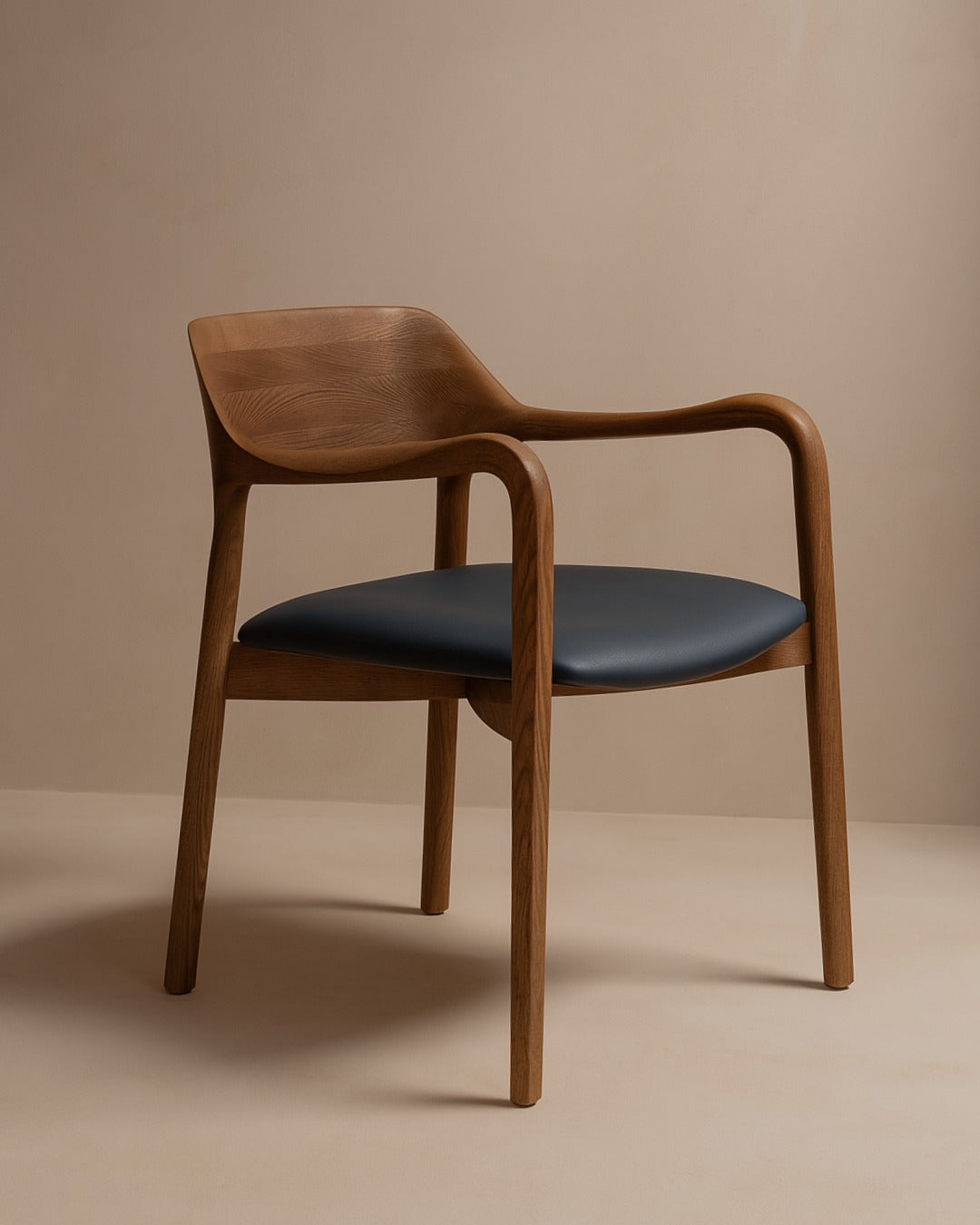 Expertly crafted from walnut, its gently curved frame and clean lines celebrate the natural warmth and grain of the wood. A softly upholstered seat ensures comfort while maintaining the chair’s sleek, lightweight silhouette.