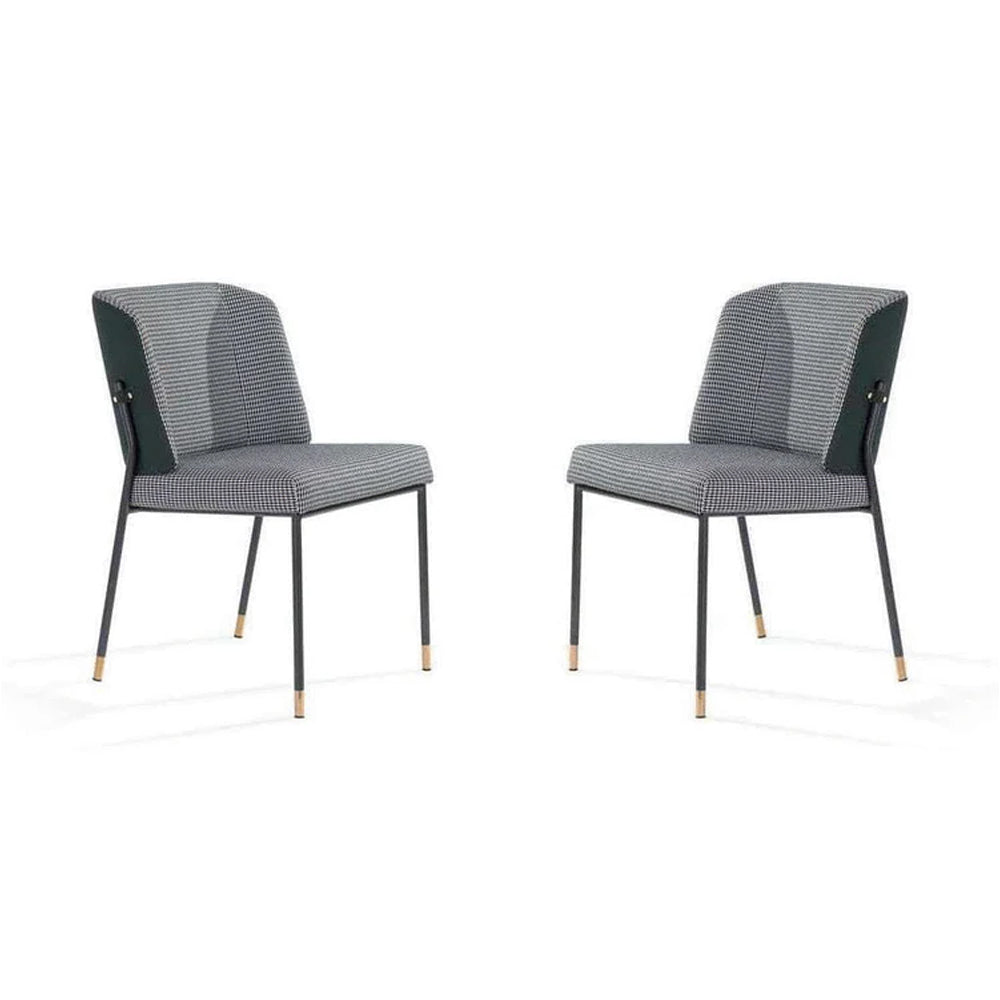 Supported by grey powder-coated metal legs, this chair is upholstered in Houndstooth black and white fabric with baretta green artificial leather accents for a stunning blend of durability and luxury. The unique contrast of materials along the sides and back adds an element of visual interest, allowing the chairs to stand apart from the crowd.