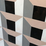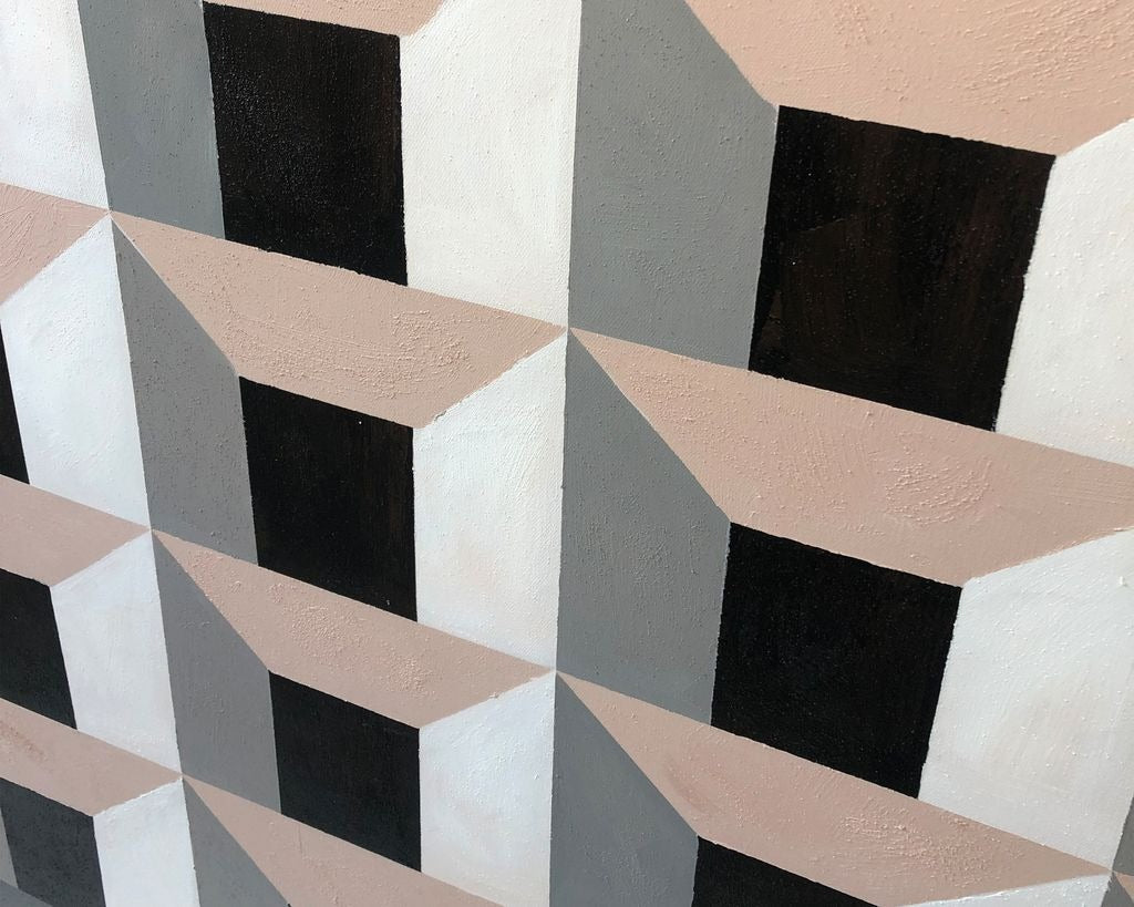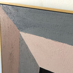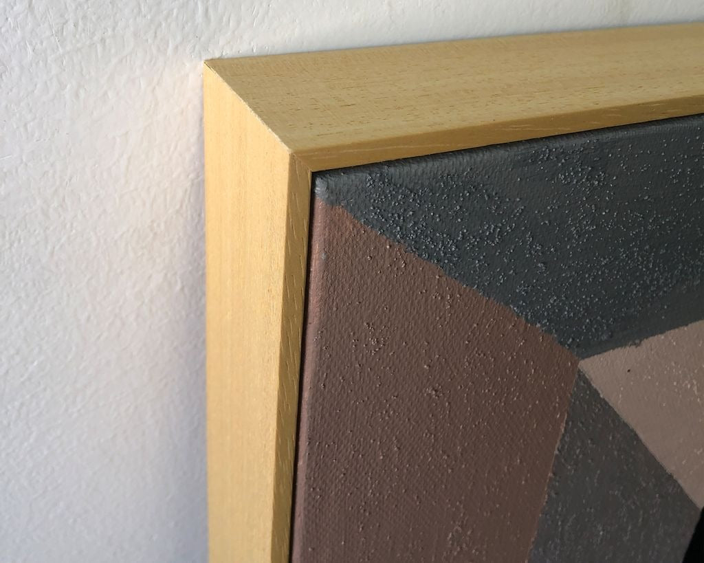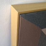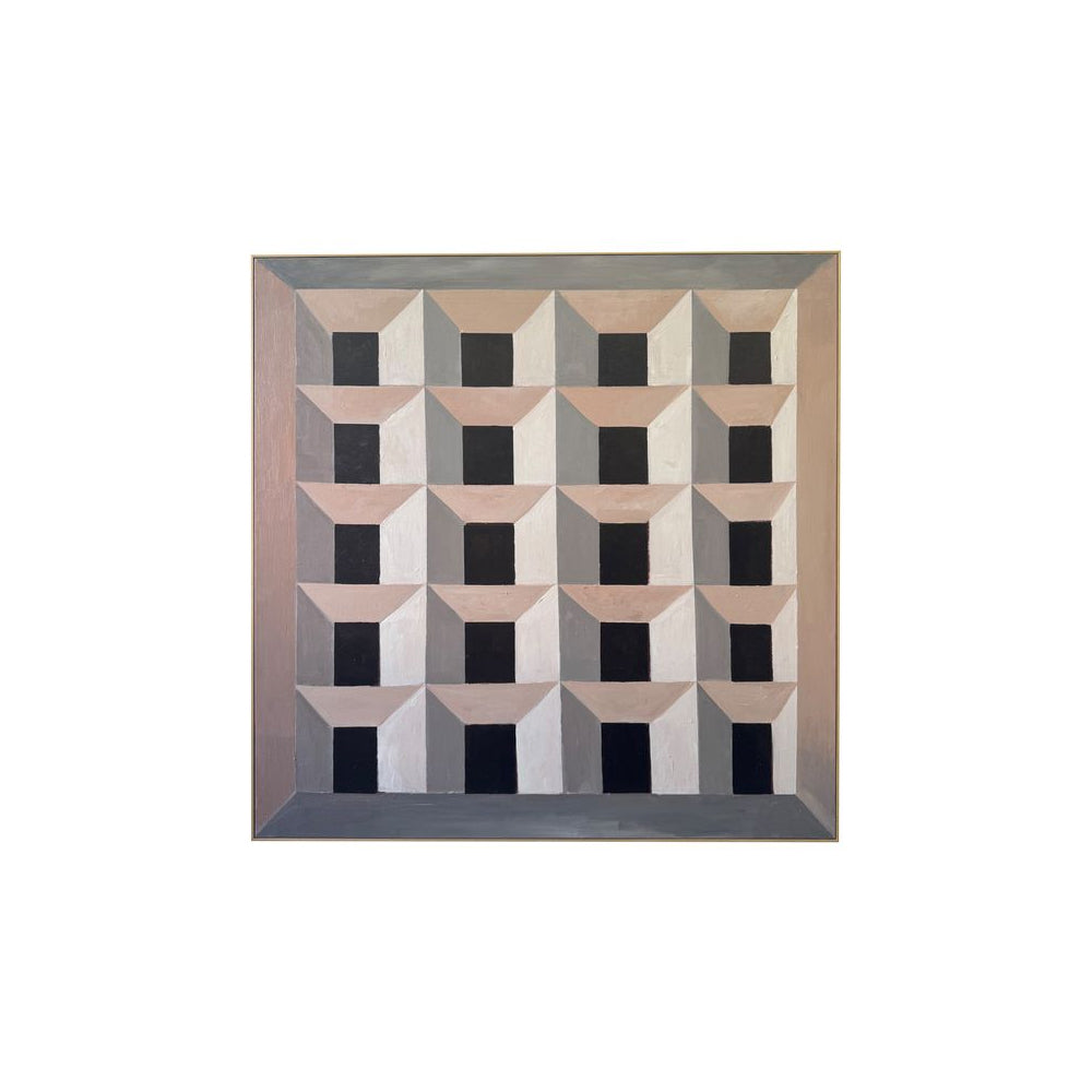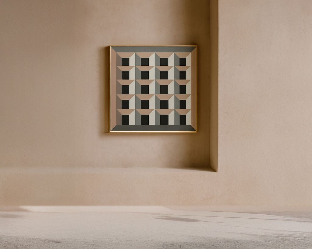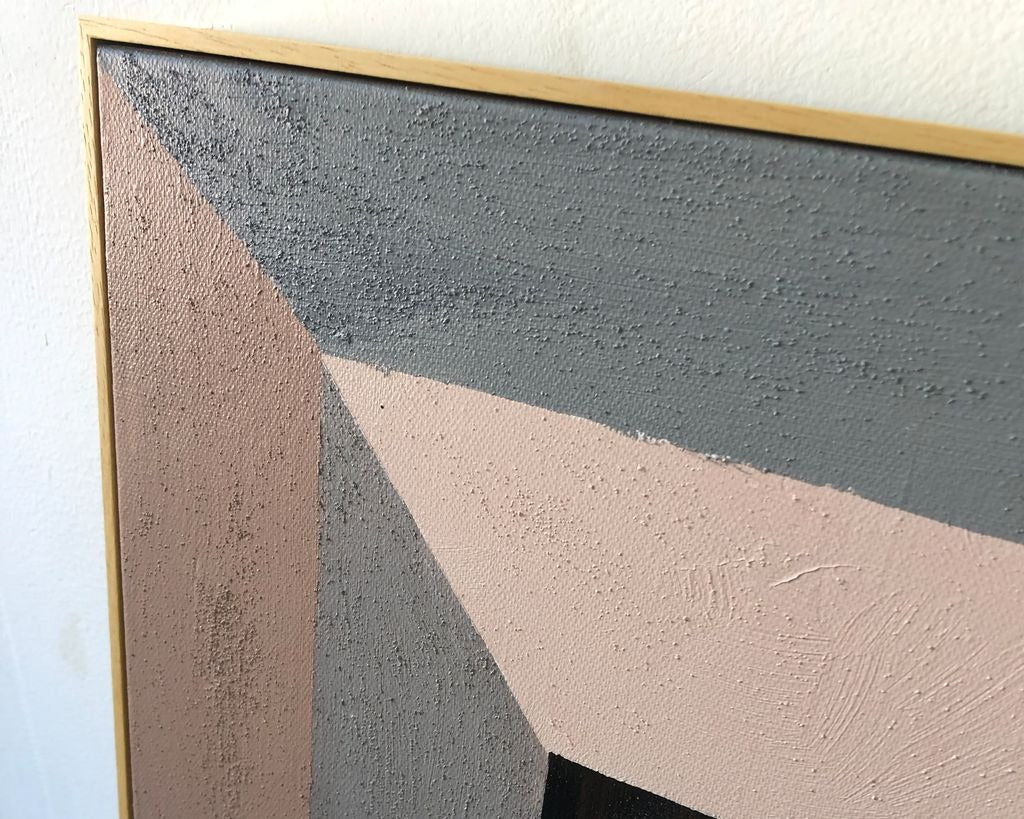Presented in a sleek oak frame, its geometric composition manipulates depth through masterful tonal contrast and angled lines, creating an optical effect that feels both structured and dynamic. Soft neutrals blend seamlessly with bold black shapes, making it a versatile piece that complements a range of interior styles.