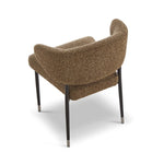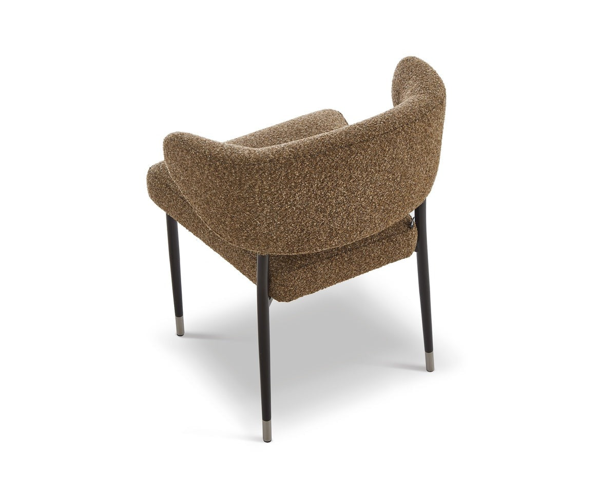Designed with a lightly curved backrest for superior comfort and support, it chair balances style and practicality with ease. Upholstered in richly textured Capela Fennel Seed fabric, it brings a warm, tactile character to any setting. The generously padded seat ensures lasting comfort, while the solid wood legs, finished in a deep tone and tipped with sleek metallic caps, add a contemporary edge.
