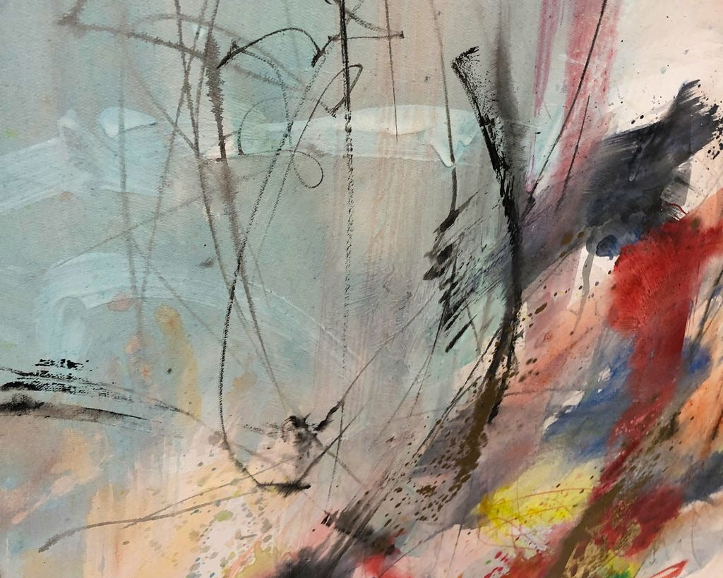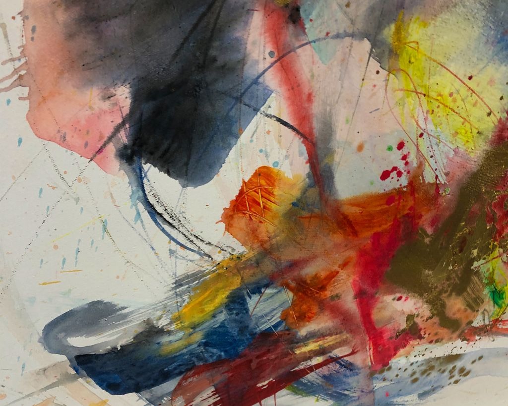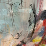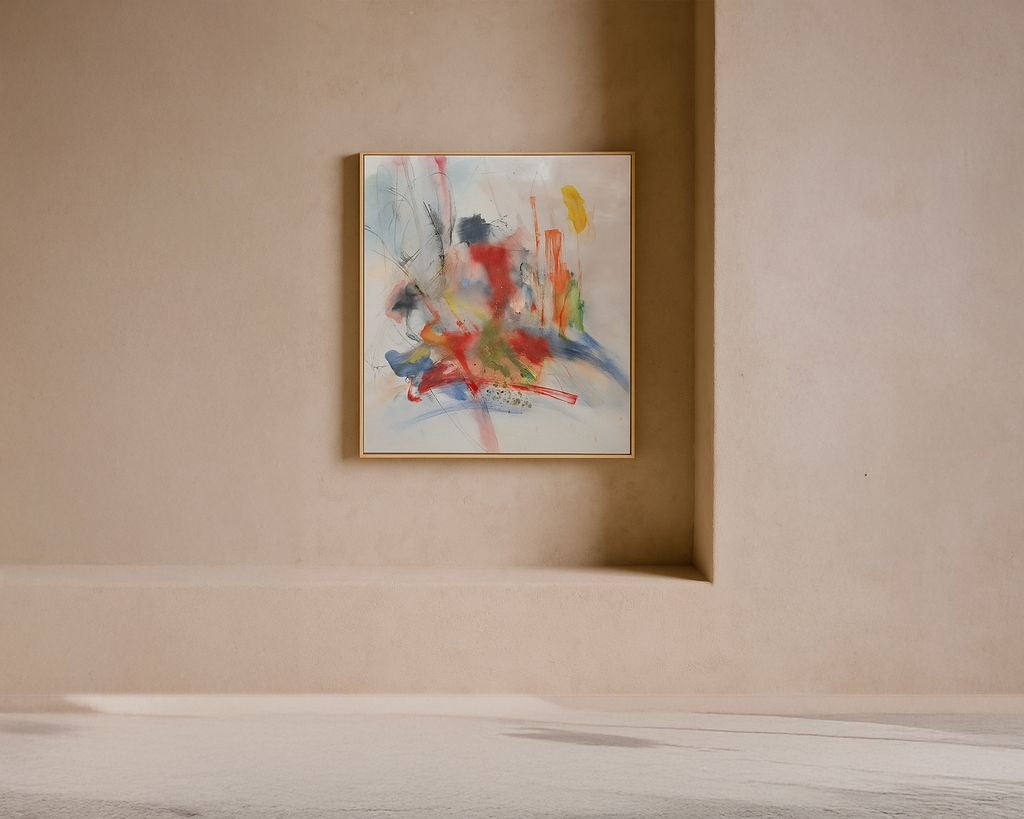 Bold reds, yellows, blues and oranges blend and overlap in an abstract composition that feels expressive without overwhelming. Layers of paint, soft washes, and delicate linework add depth and texture, offering fresh detail with every glance. Framed in sleek oak, this statement piece brings life and dynamism to any interior.