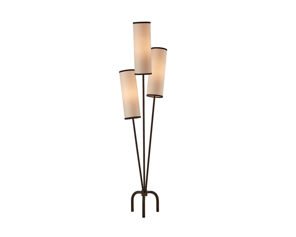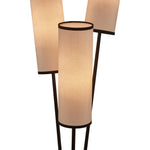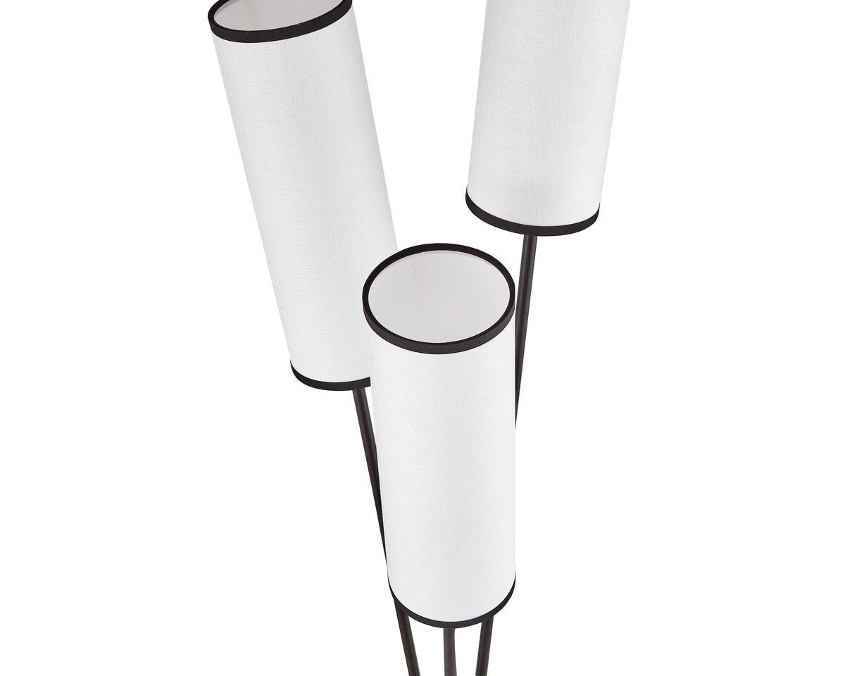 Its graceful, curved legs in black-painted metal support three cylindrical shades, each positioned at a different height for a subtle asymmetric effect. The white linen shades are trimmed with black accents at the top and bottom, creating a refined contrast that immediately draws the eye.