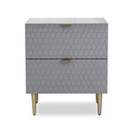The elegant Bolero collection has a stunning contemporary design which is bursting with modern accents. The drawer fronts and frame are all high gloss lacquer. They are superbly decorated with a honeycomb style hexagon pattern. The sleek legs and handles are brushed stainless steel for a touch of added style. The Liang & Eimil Bolero Bedside Table is an attractive khaki grey which will boost any room. Two drawers ensure you have ample space for storage, right where you need it. Use these in pairs to frame any bed to perfection. Give your bedroom a new twist with gorgeous interior décor that has true impact.