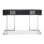 The chic minimalism of the design is continued in the table’s polished, silver-steel base. A series of slim, straight lines elegantly support the drawers resulting in a striking silhouette. Art-deco inspired, silver steel handles accent the piece and add interest to the understated design.