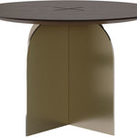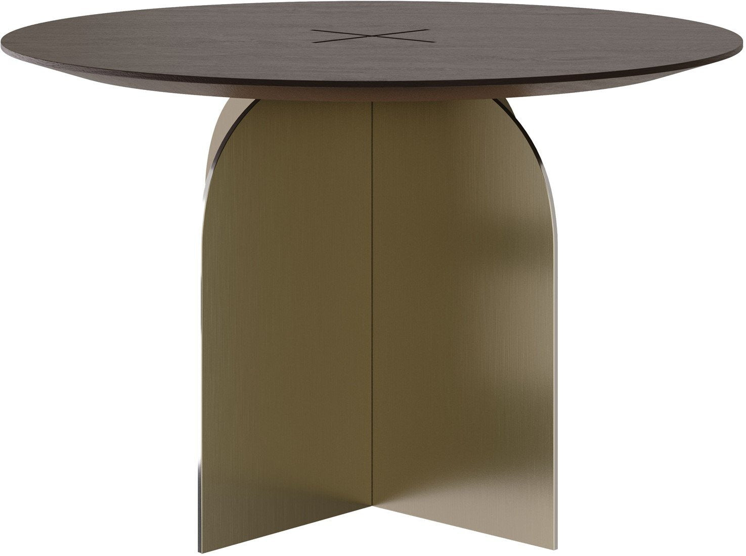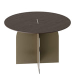 Its captivating round top, fabricated from oak veneer, emanates natural charm and resists stains, thanks to a rich brown finish. The arched crossover base, forged from bronze-finished steel, not only offers sturdy support but also injects an appealing geometric quality. The cleverly designed structure, coupled with its robust materials, ensures lasting beauty.