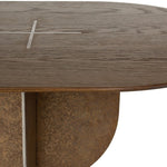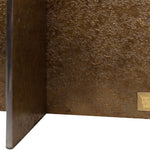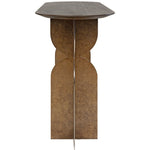 Adorning your home with a textured bronze-finished steel frame that boasts an arched crossover design, it presents a robust yet graceful silhouette. Sitting atop is a beautifully crafted oak veneer, finished in roasted coffee, offering both visual appeal and resistance against stains. The unique geometric stability of this console makes it the perfect place to showcase your cherished ornaments or treasured photos.