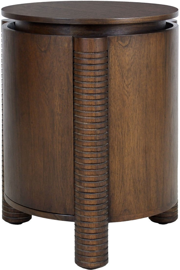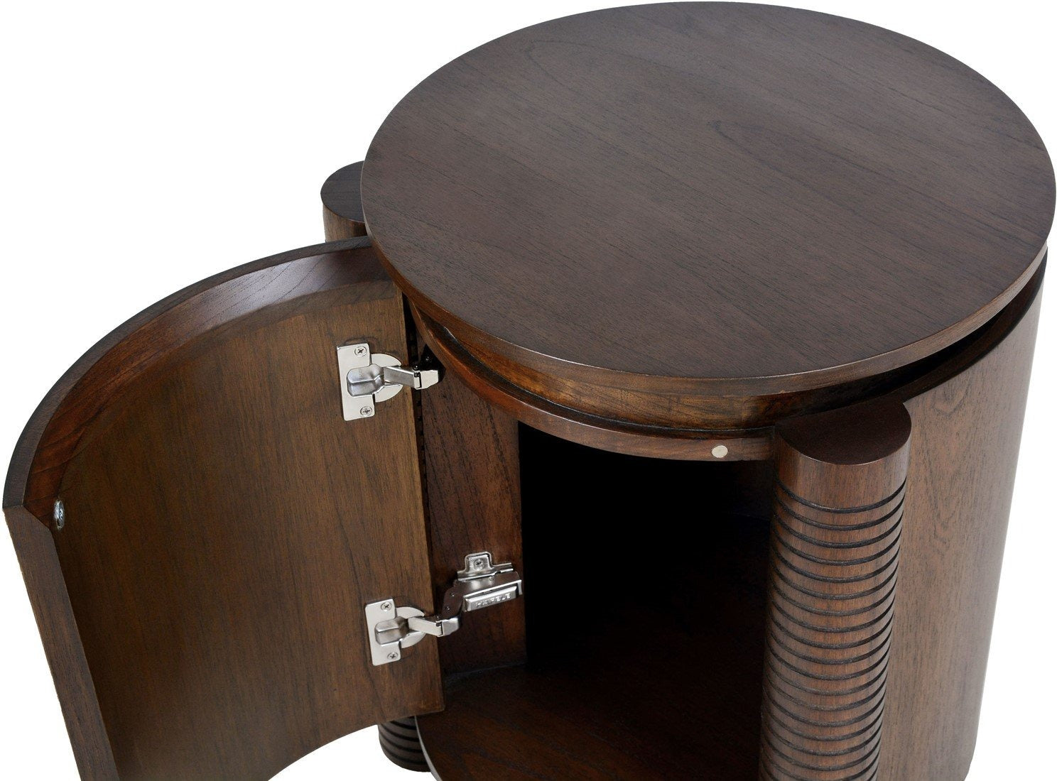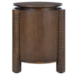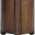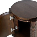 Meticulously crafted from mindi wood, this cabinet features a striking cylindrical silhouette finished in a rich roasted coffee tone, evoking mid-century elegance. Ribbed detailing on its cylindrical legs adds visual intrigue, echoing the sophistication of Art Deco design. Behind its single door lies a spacious interior, ideal for discreet storage, while its smooth top doubles as a functional side table or a platform to showcase your favourite décor.