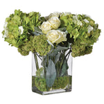 Presented in a simple glass vase, it features an abundance of rich lime-green hydrangea blossoms and elegant cream roses. This combination of flowers exudes a positive aura that evokes thoughts of purity, renewal, and new beginnings. Beautiful clusters sedums have been scattered throughout to create a sense of depth and fullness through their unique texture, whilst artificial water contributes to its authentic appearance.