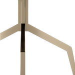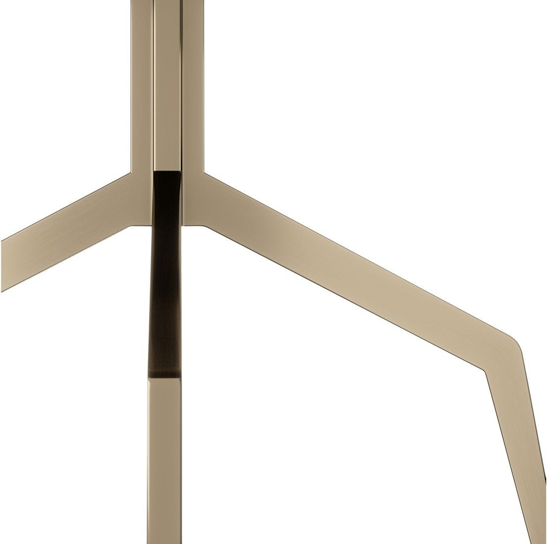 It features angular brushed bronze metal legs for sleek and elegant foundation and a stunning grey travertine tabletop, enriched with a myriad of beautiful natural flecks and variations that add depth and allure.