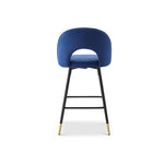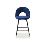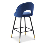 Expertly crafted with comfort and elegance in mind, it features plush blue velvet upholstery that injects warmth and sophistication to any space. It is supported by matt black wooden legs, elegantly capped with golden foot cups for a vibrant contrast. Perfect in a home bar or grouped in a commercial setting, these stools promise comfort that invites hours of relaxation.