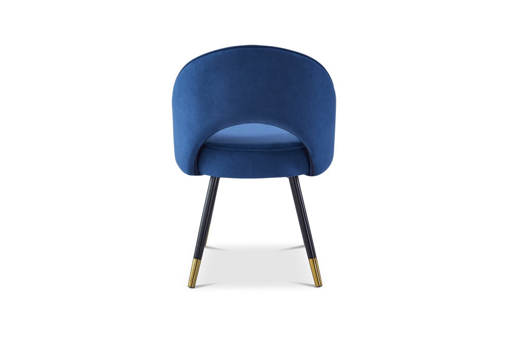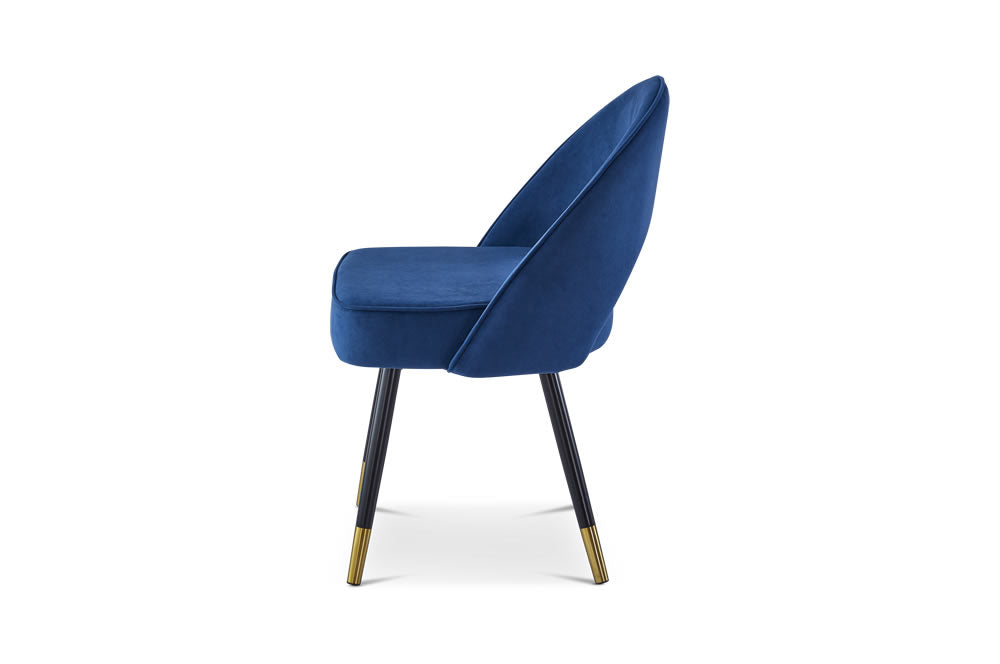 This sophisticated piece boasts style and comfort in equal measure, featuring high-quality blue velvet upholstery and contrasting matt black wooden legs, accentuated by golden feet. The perfect addition to any interior design, it creates a captivating atmosphere that will complement a modern dining table.
