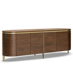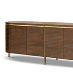 Bold yet elegant, its warm walnut veneer is enhanced by subtle planked detailing, brushed brass accents, and tapered legs. Curved edges soften the geometric structure, creating a sophisticated aesthetic that blends Art Deco glamour with high-end minimalism. The smooth, spacious top serves as the perfect surface for decorative pieces, while four discreet doors provide ample storage.