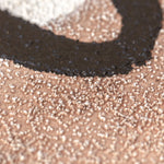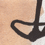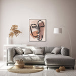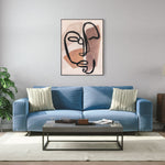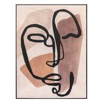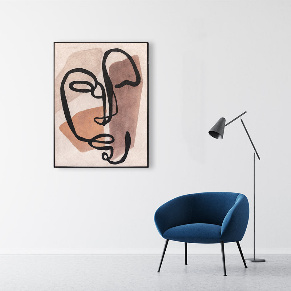 A backdrop of geometric shapes in varying earth tones is paired with a continuous thick, black line full of curves and loops which creates a minimalist impression of facial features. Coarse texture offsets its unfussy design, creating a unique marriage of modern and rustic designs. A simple black frame completes the look with a touch of class.