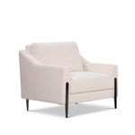 Its sculpted silhouette, plush padding, and neutral upholstery create an inviting and comfortable seat, perfect for unwinding after a long day. Slim black metal legs add a modern edge while maintaining an understated elegance.