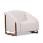 Its generously cushioned seat and curved silhouette create a cosy, inviting feel, while the soft, textured fabric enhances its tactile appeal. The distinctive wooden frame, accented with elegant brass detailing, adds warmth and a refined architectural touch.