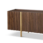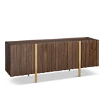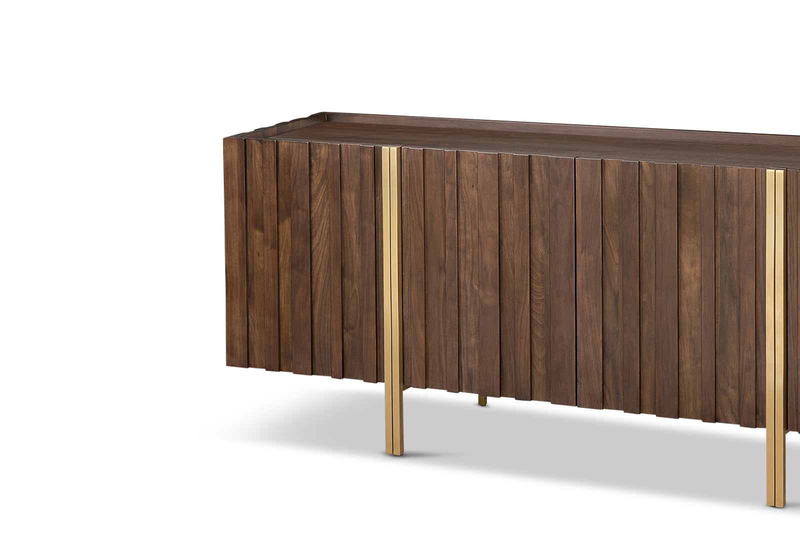 Featuring a slatted exterior, this sideboard is made from beautiful walnut-finished wood which gives it an almost rustic appearance. Hidden within its slatted design are four, discreet doors which open to reveal plenty of storage space, whilst the top is perfect for displaying ornaments and photographs. Supporting the sideboard are sleek, brass legs which provide an opulent counterbalance - this piece is as stylish as it is robust.