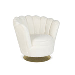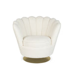 Its stylish clamshell design features a deep, plush seat and a sweeping backrest that cradles your body for added comfort and support. Soft, white upholstery furthers the appeal with an elegant, cosy feel. A gold brushed swivel base adds completes the design with an opulent gleam whilst also providing further freedom of movement and convenience.